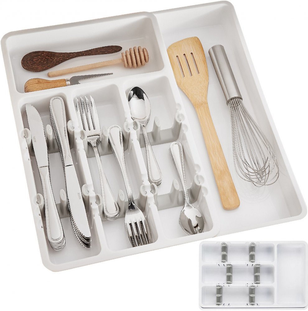 1× výsuvný plastový organizér na příbory (bílý/šedý)