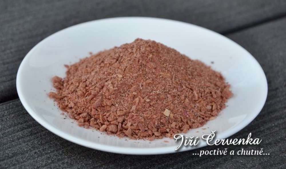 Složení: Cibule, černý pepř, zázvor, muškátový ořech, směs přírodního koření, zvýrazňovač chuti (E621), stabilizátor (E450), emulgátor (E471), dextroza, regulátor kyselosti (E300), antioxidant (E301), paprikový výtažek (E160c). Může obsahovat stopy celeru, sezamu a hořčice.