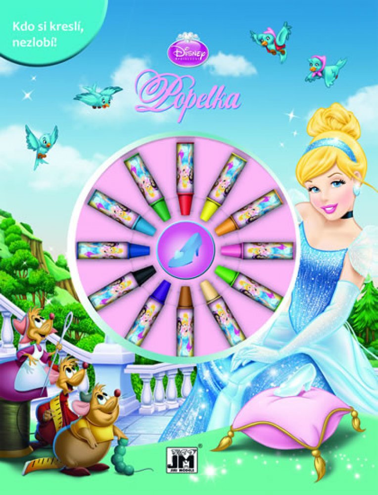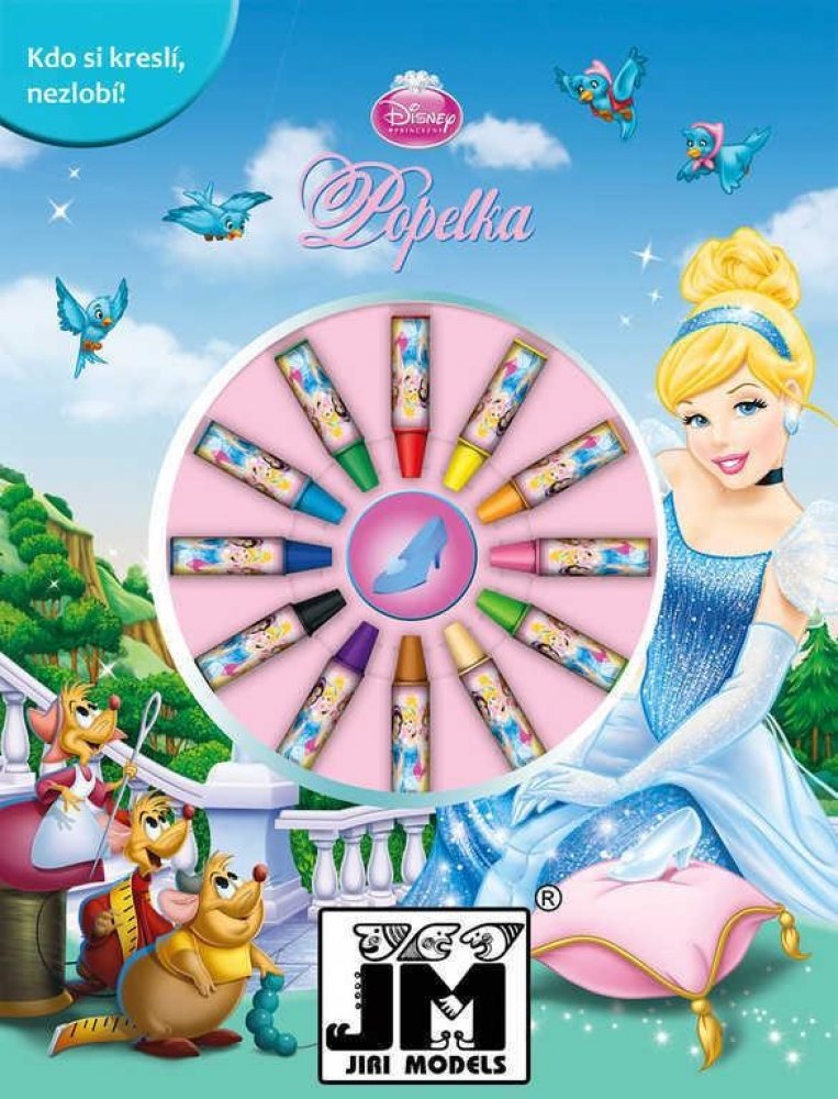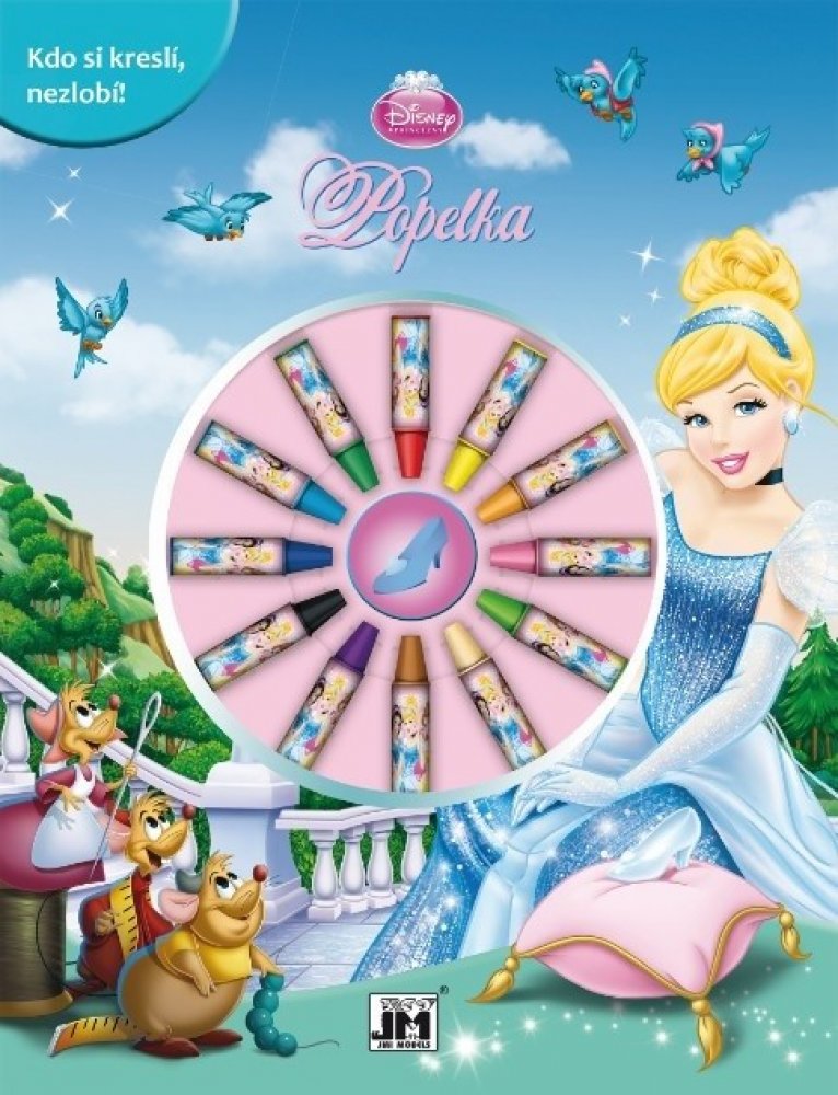 Omalovánka "Kdo si kreslí, nezlobí" obsahuje 24 perokreseb k vymalování a 12 barevných voskovek v oblíbených pohádkových motivech "Popelka" Sada s voskovkami
