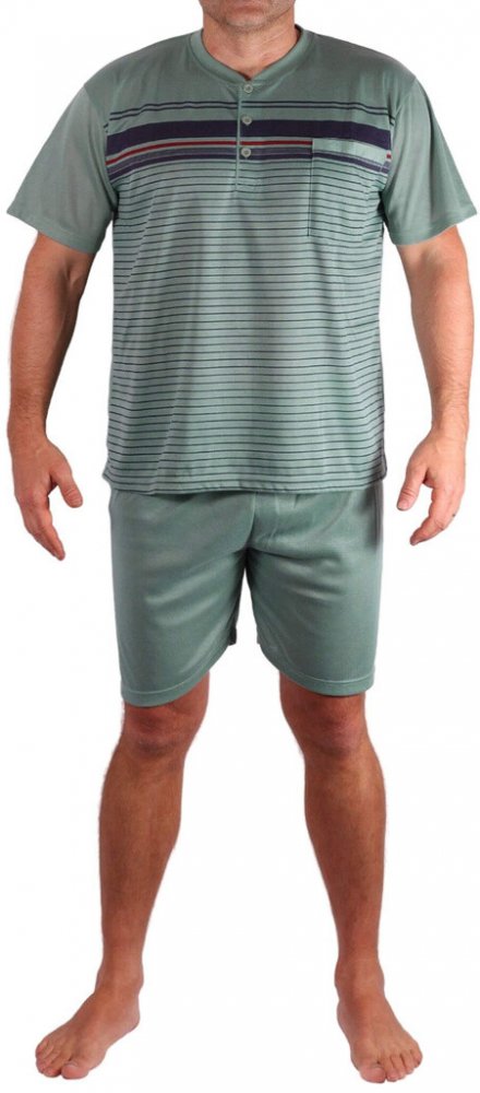 Jiří je dvoudílné pánské pyžamo s krátkými rukávy a krátkými nohavicemi. V tradičním provedení pro pohodové muže. Horní díl - volné tričko - má zapínání na knoflíky a funkční kapsu. Krátké rukávy i nohavice Přední díl trička je zdoben vodorovnými pruhy Zadní díl je hladký jednobarevný V klopě funkční i ozdobné zapínání na tři knoflíky Na levé straně kapsa - výška 14 cm x šířka 12 cm V průkrčníku j...
