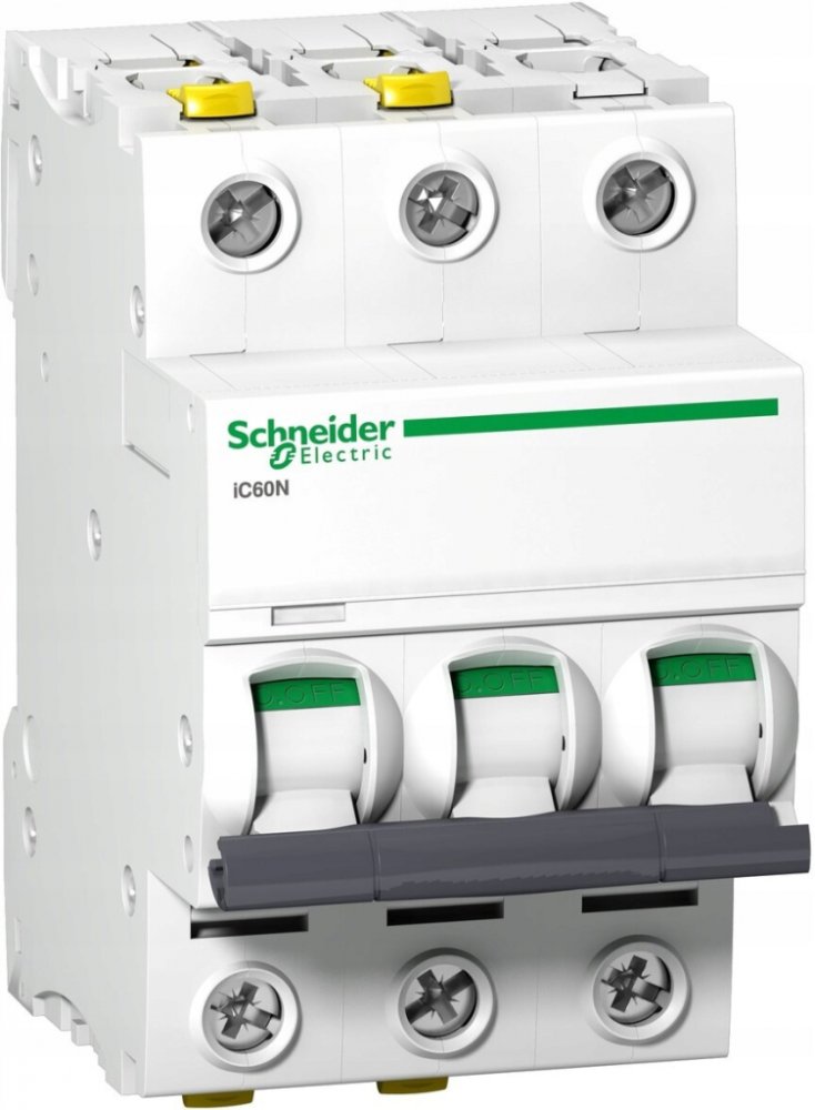 - Nadproudový spínač řady iC60N s číslem A9F04320, iC60N-C20-3, 3-pólový (třípólový), 20A, charakteristika C, zkratová odolnost 6kA, zabezpečuje ochranu před zkraty ...