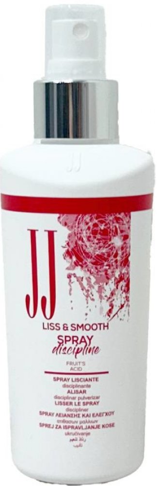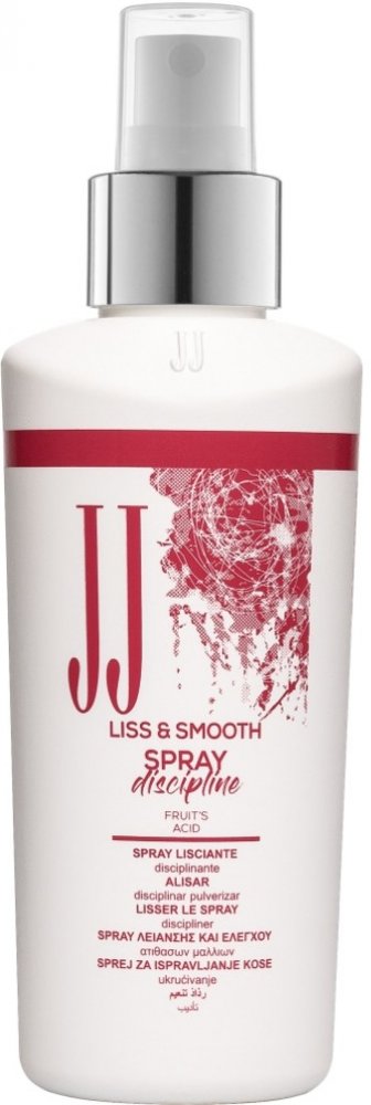 JJ Liss & Smooth vyhlazující sprej proti krepatění vlasů (Spray Discipline/Fruit's Acid) s ovocnými kyselinami uzavírá a uhlazuje kutikulu, zanechává vlasy hladké a lesklé a eliminuje jejich krepatění (Anti-frizz). Sprej s okamžitým účinkem zkrotí a hydratuje nepoddajné a krepaté vlasy díky obsahu ovocných kyselin z pomeranče a jablka, které má antistatické a uhlazující vlastnosti na vlasech. Kyselinotvorné složky napomáhají uzavírat a uhlazovat kutikulu vlasu, čímž navrací vlasům oslnivý lesk. Sprej vlasy zjemňuje a chrání je dlouhodobě před okolní vlhkostí.