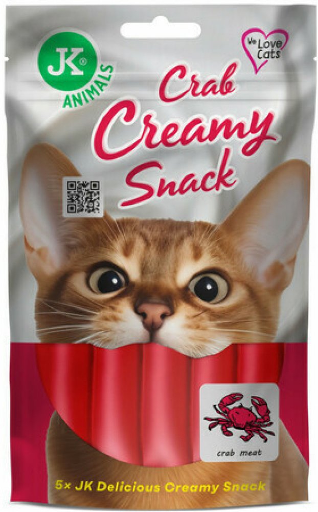 Pamlsky JK ANIMALS krabí krémový pamlsek: lahodný krémový pamlsek pro kočky, obsahuje 25 % kraba, 22 % kuřecího masa, 5 % kuřecích jater, 3% kuřecí srdce, obohaceno o vitamíny A, B2, D3 a Taurin pro zdravý zrak, krásnou srst, vitalitu a zdravé srdce, BEZ umělých barviv, BEZ aromat a BEZ umělých konzervantů, (5× 15 g) 5 ks sáčků.