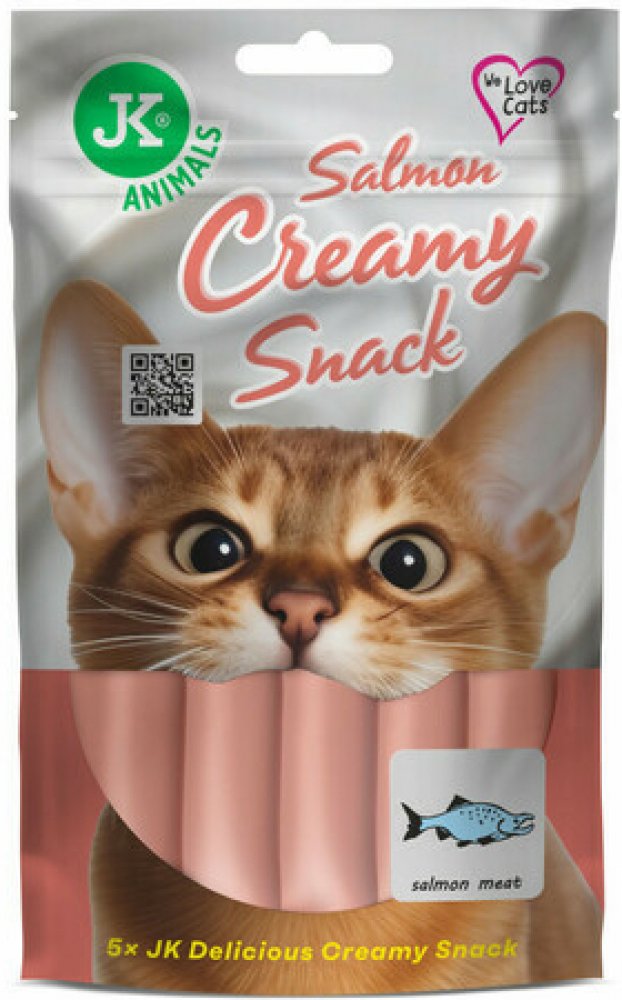 Pamlsky JK ANIMALS lososový krémový pamlsek: lahodný krémový pamlsek pro kočky, obsahuje 25 % lososa, 22 % kuřecího masa, 5 % kuřecích jater, obohaceno o vitamíny A, B2, D3 a Taurin pro zdravý zrak, krásnou srst, vitalitu a zdravé srdce, BEZ umělých barviv, BEZ aromat a BEZ konzervantů, (5× 15 g) 5 ks sáčků.