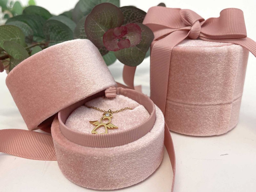 Luxusní růžová sametová krabička s mašlí je vhodná pro dárkové zabalení řetízku. Rozměr krabičky je 60x60x55 mm.