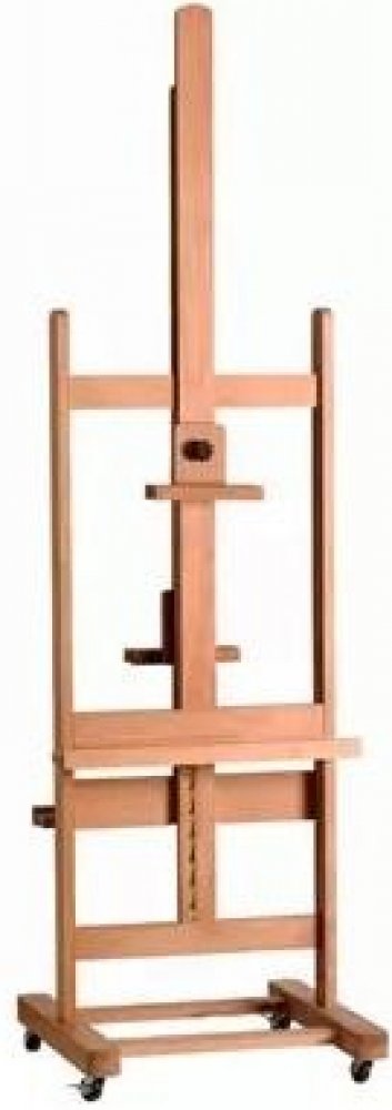 Tento stojan je vyráběn z kvalitního bukového dřeva. Je robustní a posun vodící tyče s podpěrným korýtkem pro plátno je oboustranně zajištěn kovovým mechanismem. Pro lepší manipulací je opatřen kolečkami s brzdou.