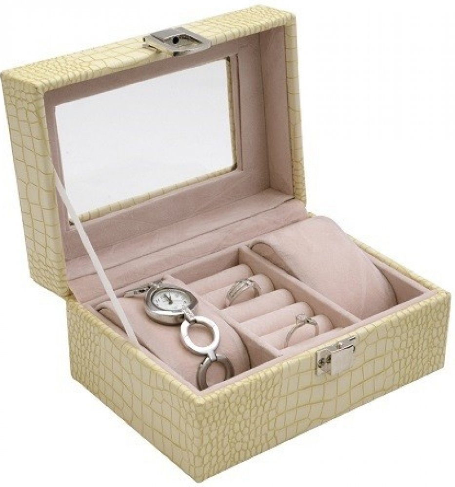 JK BOX SP-1813/A20, Dámská kazeta na hodinky a šperky – Praktická dámská kazeta určená k uložení až 2 kusů náramkových hodinek, ale také k uložení šperků. Kazeta je vyrobena ze syntetické kůže v krémové barvě. Povrch kazety je zdařilou imitací krokodýlí kůže. Vnitřní část kazety je potažena světlým sametem, který chrání uložené hodinky a šperky před nechtěným oděrem. Víko kazety je prosklené. Celkové rozměry kazety: 155 mm x 80 mm x 110 mm Udělejte radost svým blízkým a věnujte jim vhodný dárek v podobě dámské kazety na hodinky. Vybírejte ze široké nabídky šperkovnic našeho internetového obchodu Zlatnictví U Kostela.