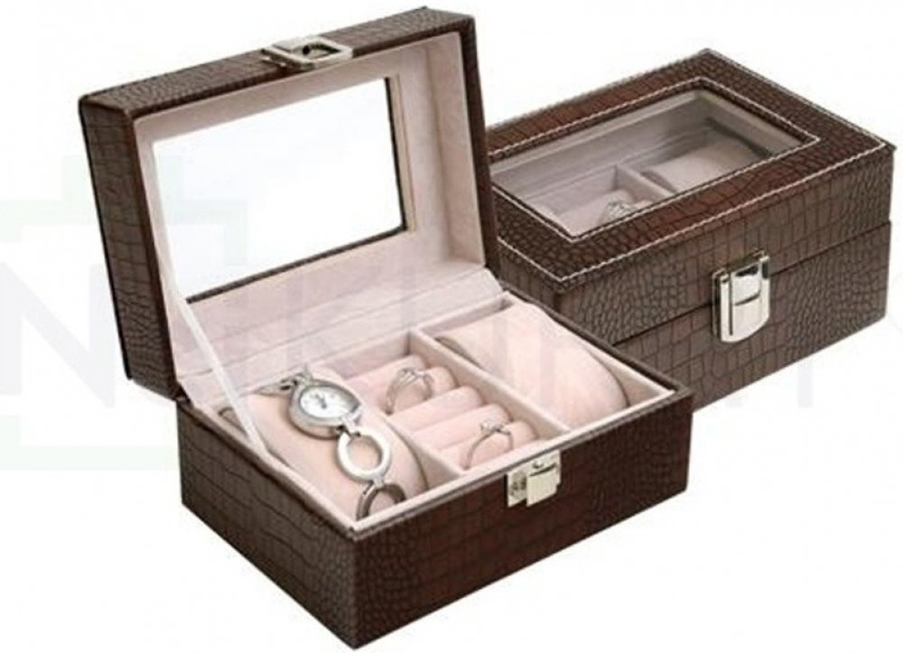Kazeta obsahuje dva flexibilní polštářky pro uložení hodinek nebo náramků a pět slotů na prsteny. Víko kazety je prosklené. Povrch kazety je vyroben z kvalitní koženky v imitaci krokodýlí kůže.Šperky na fotografii nejsou součástí šperkovnice