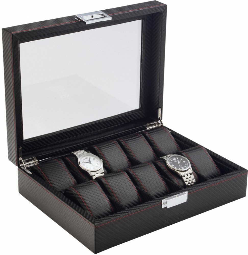 Kazeta na hodinky JK Box SP-698/A25 černá Moderní carbonový design a dokonalé zpracování v kombinaci se syntetickou kůží černé barvy s výrazným červeným prošitím, vytváří luxusní kazetu na hodinky, do které budete ukládat své oblíbené kousky hodinek s radostí.