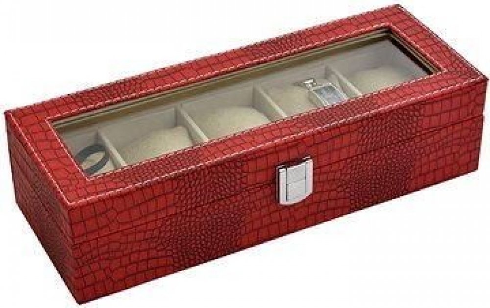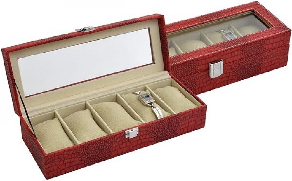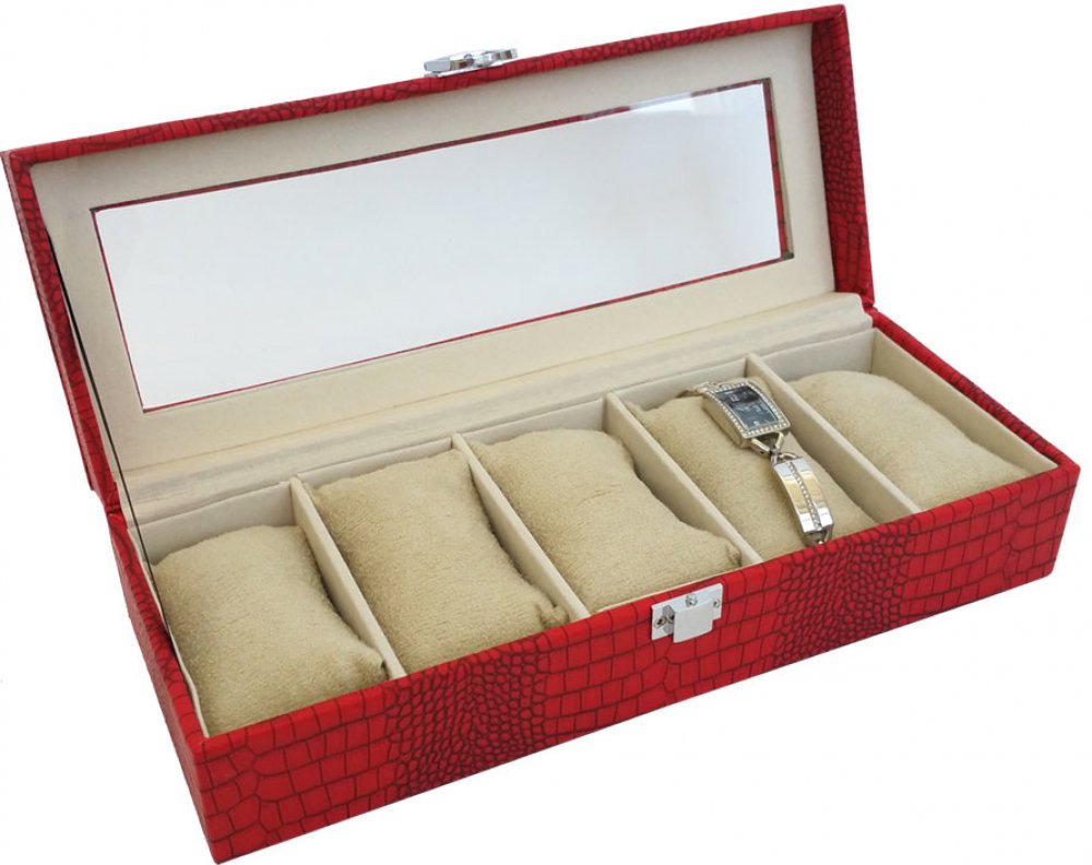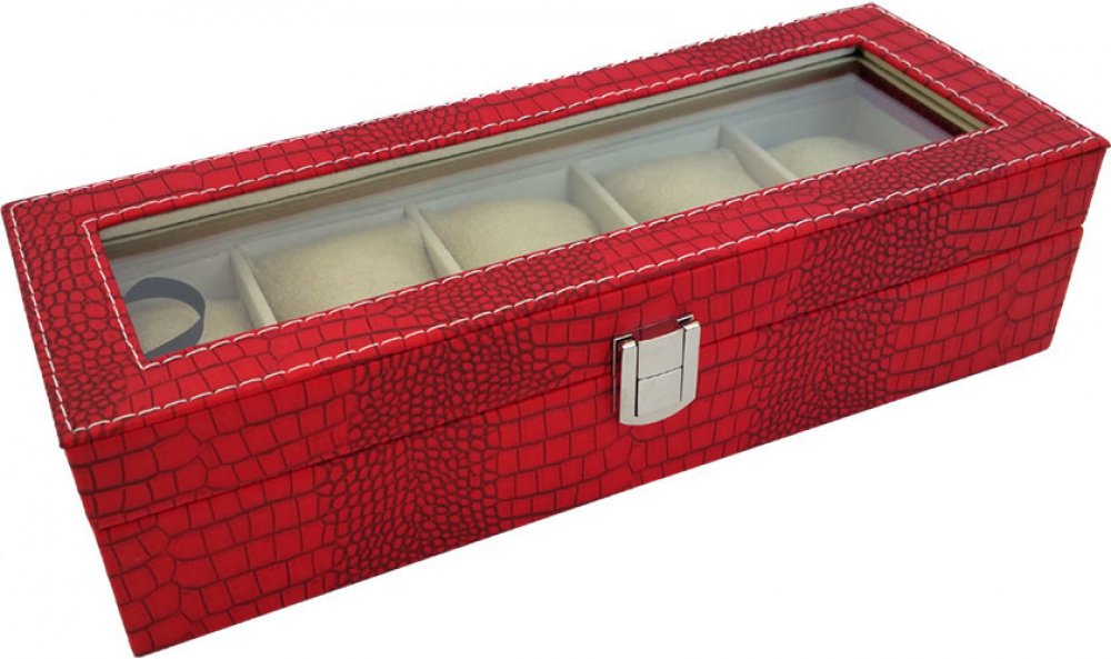 Uložte své hodinky do elegantní kazety, která má ve vnitřku jemnou sametovou látku. Ukládejte své oblíbené hodinky do elegantní kazety se vzorem krokodýlí kůže a ochraňte je tak od zbytečného prachu a poškození. Kazeta má povrch vyrobený ze syntetické červené kůže, která je na okrajích prošitá kontrastní bílou nití. Vnitřek ze sametové látky je rozdělen na části pro pět kusů hodinek. Do šperkovnice snadno nahlédnete přes průhledné víko. Zapínání je na sklopný zámeček. Proč si zvolit tuto kazetu na hodinky? kvalitní syntetická kůže s krokodýlím vzorem červená barva kůže s kontrastní bílouprůhledné víkozavírání na sklopný zámeček