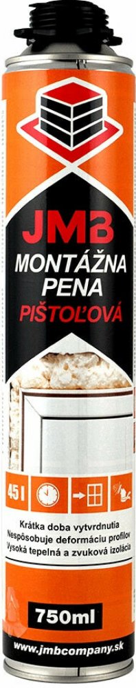 JMB montážní PUR pěna pistolová 750 ml jednosložková polyuretanová montážní pěna ve verzi s pistolovým aplikátorem, určená pro profesionální montáž, těsnění a odhlučnění. Pěna vytvrzuje pod vlivem vlhkosti ve vzduchu. JMB montážní polyuretanová pěna velmi dobrou přilnavost k většině materiálů používaných ve stavebnictví, jako jsou: polystyren, PVC-U profily, dřevo a materiály na bázi dřeva, minerální podklady (cihla, beton, sádra), kov. Pěna nepřilne k materiálům jako: silikon, teflon, polyethylen a polypropylen. Výhody Precizní aplikátor pěny Vysoký a konstantní tlak pěny až do konce použitelnosti Vysoká tepelná a zvuková izolace - 62 dB Odolnost proti plísním a houbám Žádné MDI výpary během aplikace a po úplném vytvrzení pěny Aplikace montáž oken a dveří Tepelná izolace vodovodních, kanalizačních sítí a sítí ústředního topení Těsnění a montáž parapetů Tepelná izolace střech a plochých střech Vyplnění mezer (do šířky 2cm) v tepelné izolaci při zateplování budov Počet kusů v kartonu: 12 ks