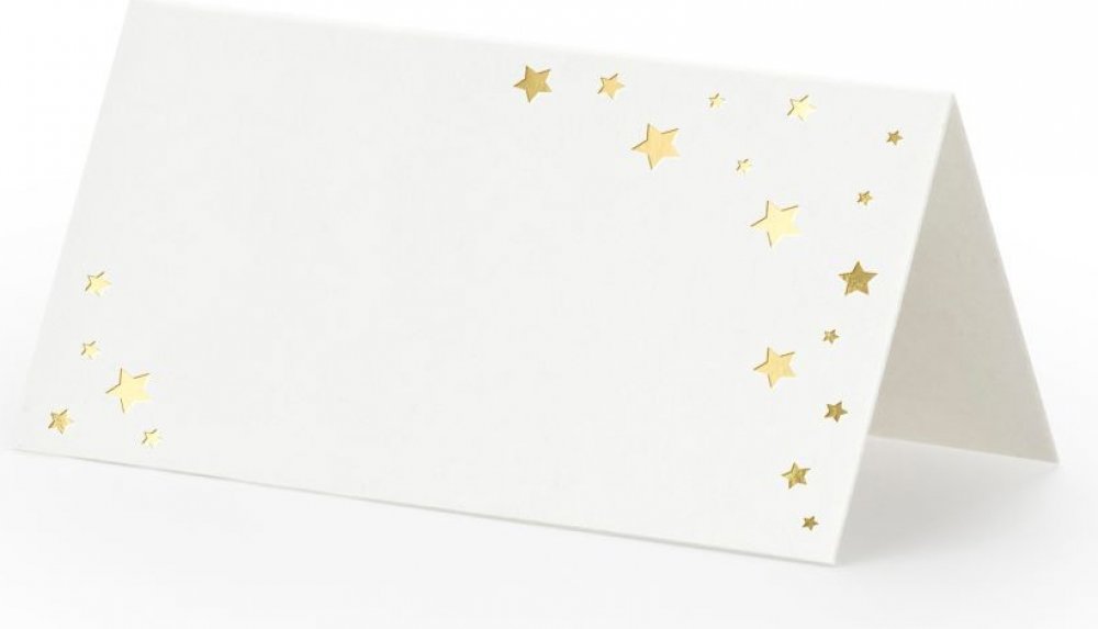 Ať už plánujete párty nebo svatbu určitě vám přijdou vhod tyto decentní jmenovky, které mají ozdobné zlaté hvězdičky. Působí ladným a čistým dojmem. Jmenovky jsou dodávány v rozloženém stavu, vyrobeny jsou z pevného papíru, a k jejich použití vám stačí jediné… Ohnout ji v připravené drážce a dopsat na ni jméno hosta.