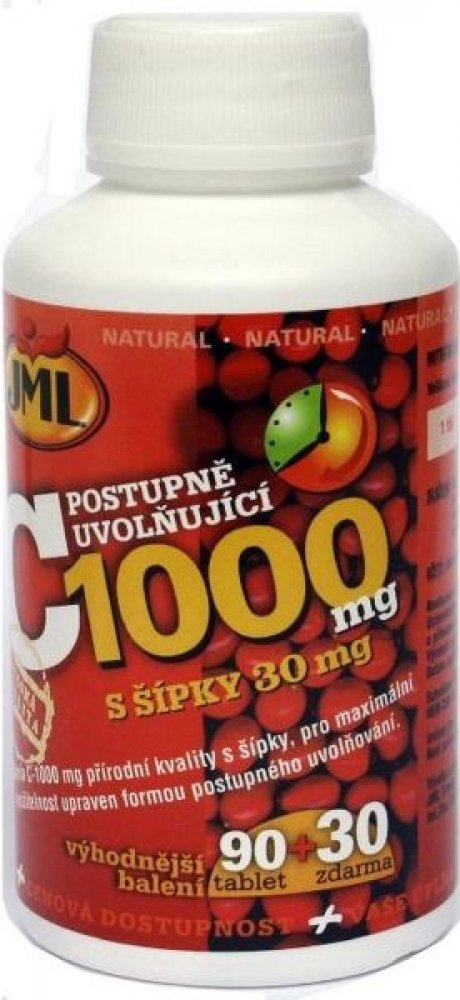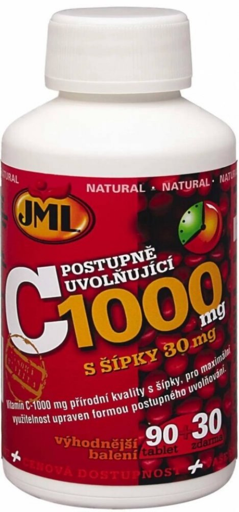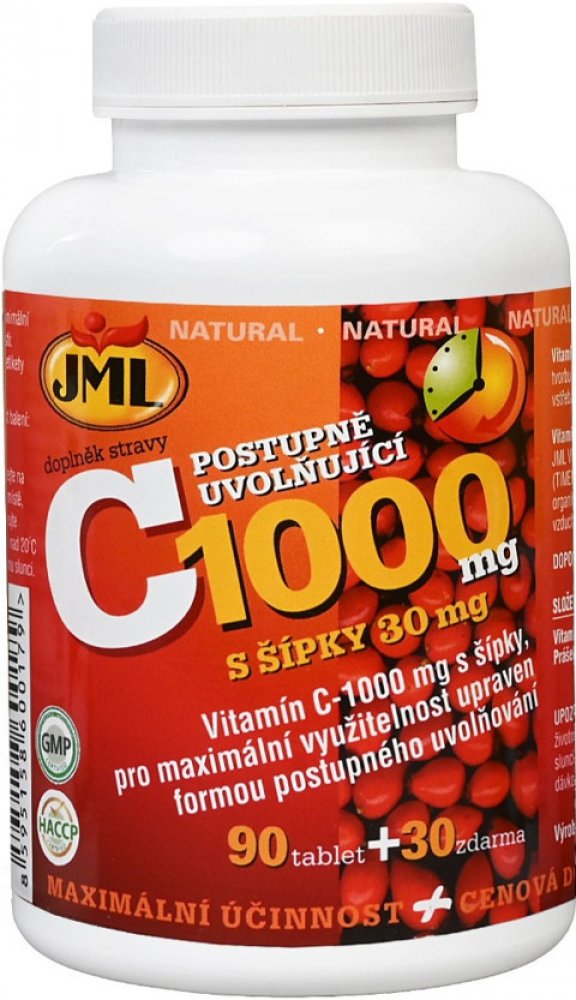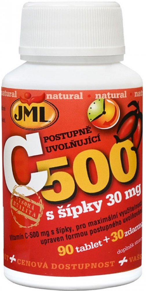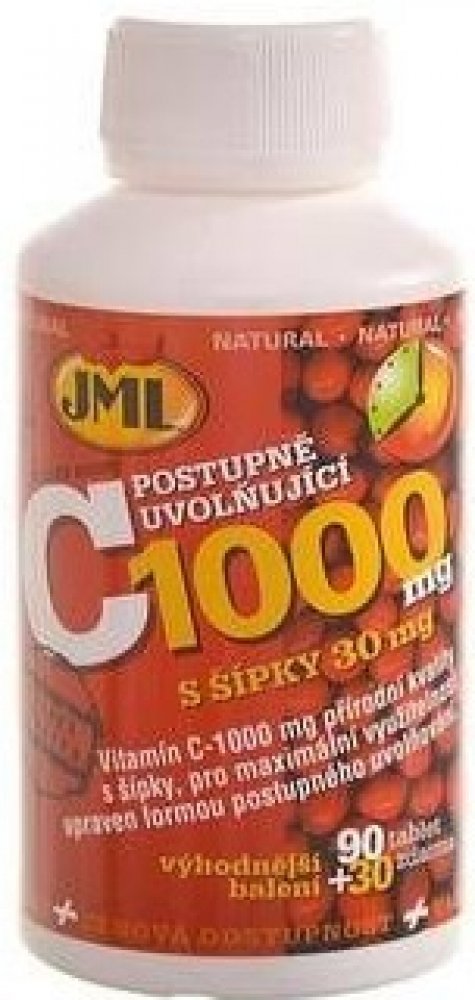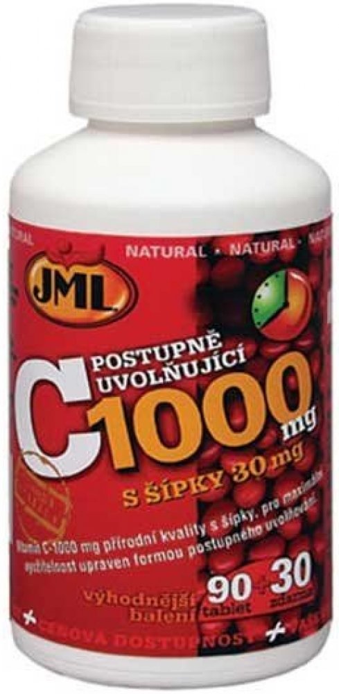 JML Vitamin C-500 mg a C-1000 mg eliminuje tento negativní jev, který brání dokonalému využití dodaného množství vitaminu, formou postupného uvolňování (timed release). Takto upravené tablety zabezpečují plynulý přísun vitaminu C do organismu v průběhu dne bez zbytečných ztrát a umožňují tak maximální využití celé podané dávky. Vitamin je získáván z nejčistších a nejčerstvějších zdrojů přírodní kvality. Součástí tablet je i prášek z růžových šípků v množství 30 mg, který je zdrojem bioflavonoidů, látek rostlinného původu, které významně zesilují působení vlastního vitaminu C, jak jej nacházíme v ovoci či zelenině.