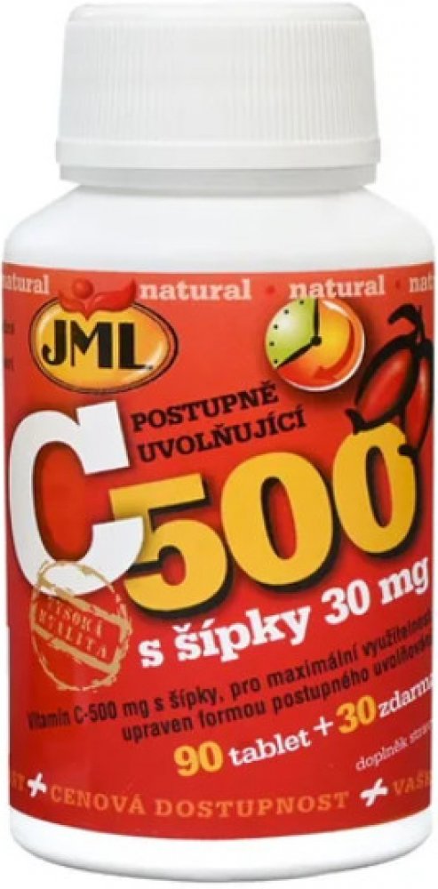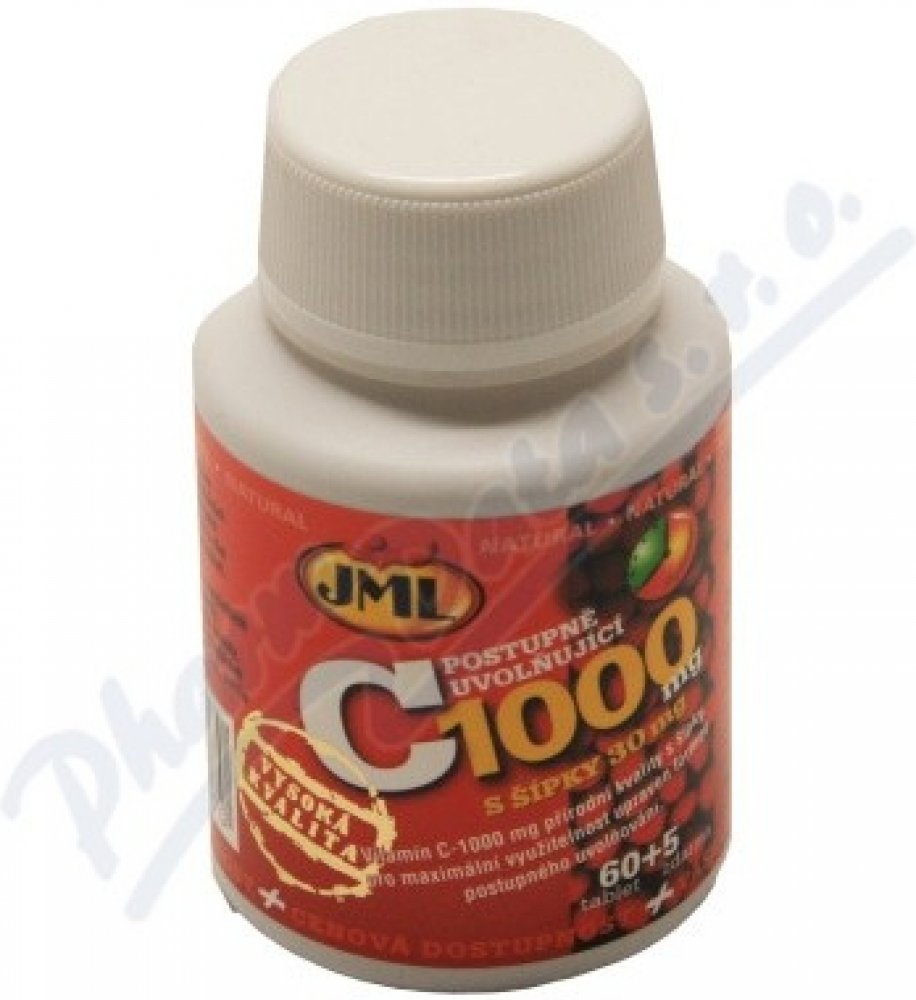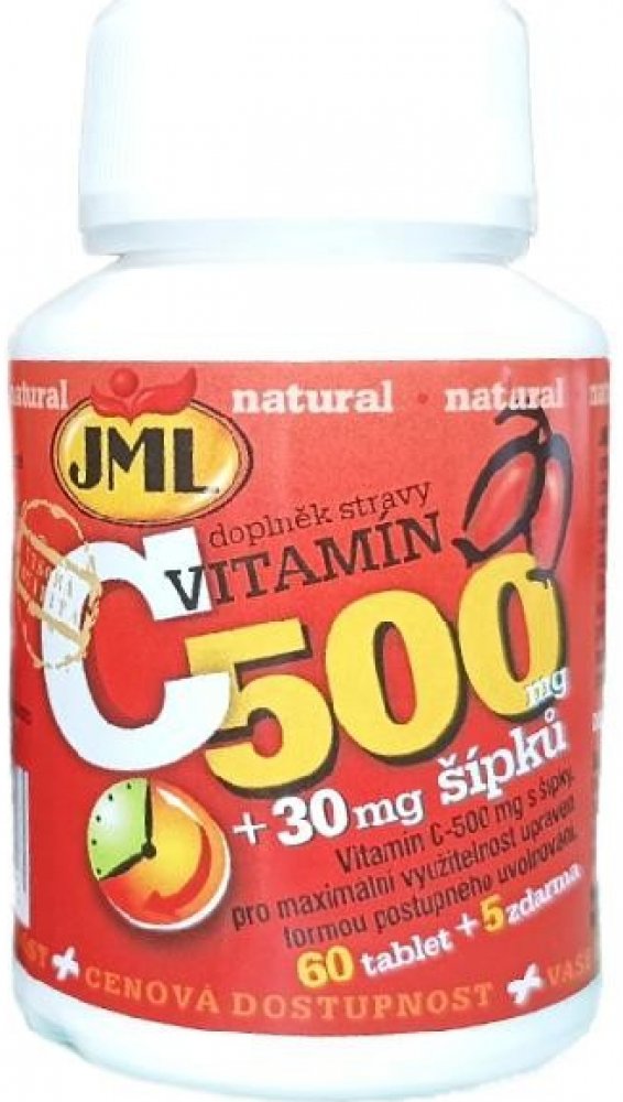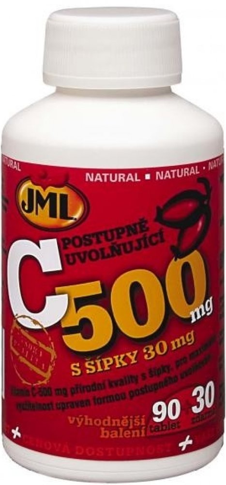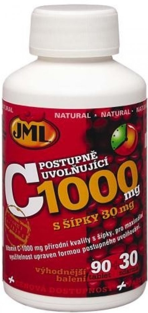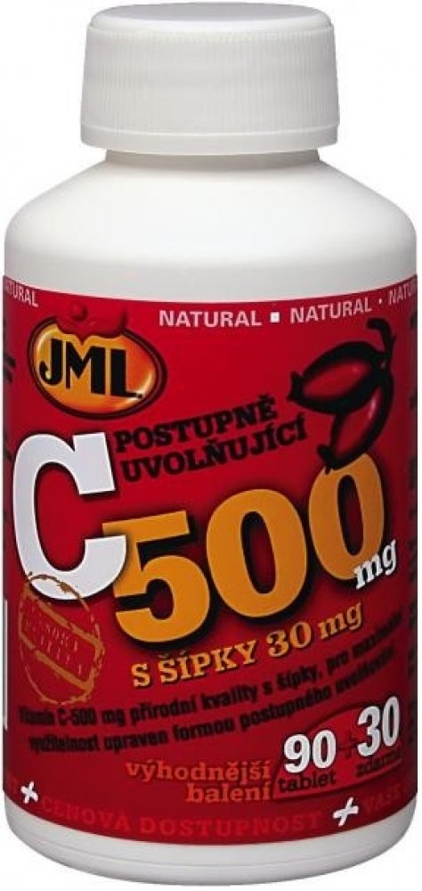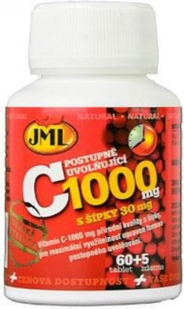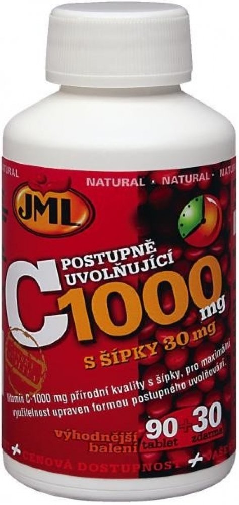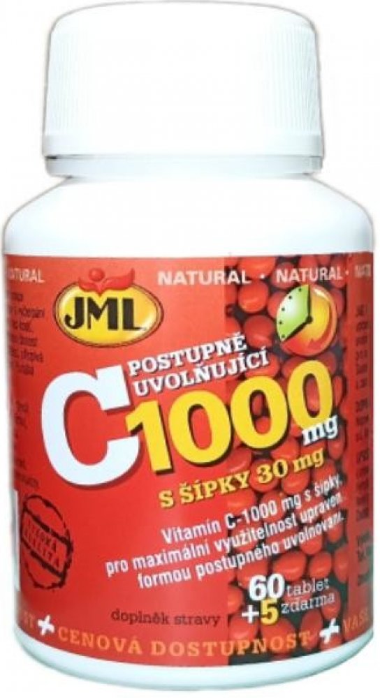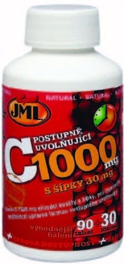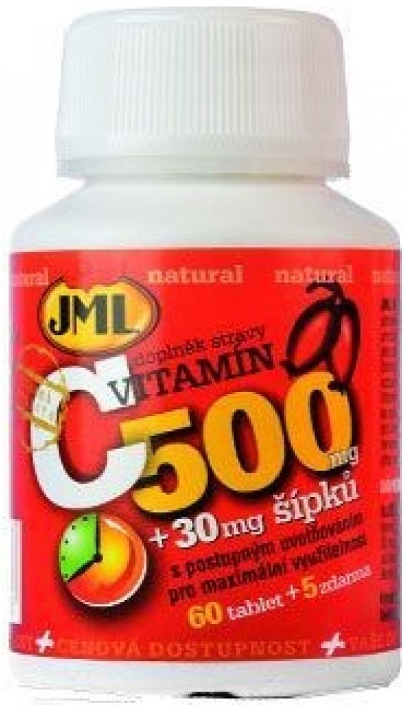 JML Vitamin C-500 mg a C-1000 mg: eliminuje tento negativní jev, který brání dokonalému využití dodaného množství vitamínu, formou postupného uvolňování (timed release). Takto upravené tablety zabezpečují plynulý přísun vitamínu C do organismu v průběhu dne bez zbytečných ztrát a umožňují tak maximální využití celé podané dávky. Součástí tablet je i prášek z růžových šípků v množství 30 mg, který je zdrojem bioflavonoidů, látek rostlinného původu, které významně zesilují působení vlastního vitamínu C, jak jej nacházíme v ovoci či zelenině.