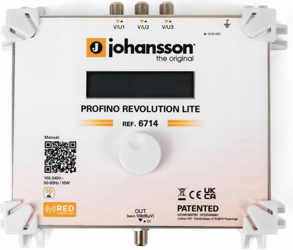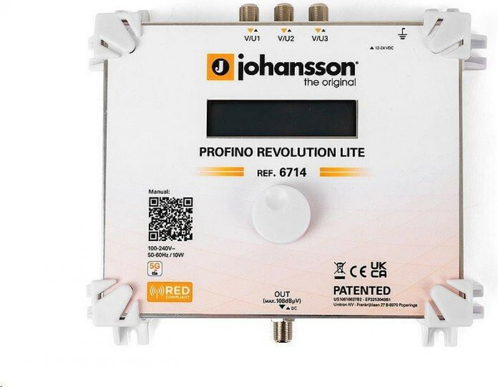 Johansson Profiler Revolution je snadno použitelný programovatelný filtrový zesilovač a kanálový procesor (převodník) pro pozemní signály. Modul optimalizuje pozemní VHF / UHF a FM signály z několika vstupů s cílem poskytnout vysoce kvalitní obraz na televizní obrazovce.Nejmodernější programovatelný filtr zesilovače na trhu, který nemá obdobu kvůli své revoluční technologii. Vlastnosti: Dokáže zpracovat a převést více než 50 kanálů (skládající se z 32 filtrů, každý o šířce až 6 MUXů) Dokáže převést výstupní kanály do S-Band (S-pásma) Ochrana 5G LTE (694 MHz) Nejostřejší filtry na trhu (50 dB na sousedních kanálech) AGC v reálném čase na všech jednotlivých multiplexech Snadné programování pomocí jednoho otočného tlačítka Možnost automatického SKENOVÁNÍ kanálů Naprostá flexibilita při přiřazování filtrů z libovolného vstupu. Každý kanál může být frekvenčně posunut na jakýkoli jiný kanál v pásmu VHF, S-Band nebo UHF (Flex Matrix) Aby se zabránilo neoprávněným osobám měnit nastavení, lze produkt uzamknout bezpečnostním kódem Vyrobeno v Evropě, pro celosvětové použití 3 VHF/UHF vstupy / 32 filtrů / AGC / 12-24 V / dálkové napájení Napájení přes výstupní F-konektor Rozměry produktu (V x Š x H): 165 mm x 190 mm x 59 mm (pouze zesilovač) počet vstupů 3 VHF/UHF počet výstupů 1 (VHF, S-pásmo, UHF) vstupy 3x BIII/DAB (174-240 MHz), UHF (470-694 MHz) vstupní úroveň VHF/UHF 37-109 dB programovatelné vstupy 3x VHF/UHF LTE filtr 694 MHz (5G) počet / šířka filtrů 32x cluster filtr / 1 až 6 MUXů počet kanálů více než 50 (32 filtrů) kombinace (konverze) programování vstupů z jakéhokoli VHF nebo UHF kanálu do jakéhokoli kanálu VHF, S-pásma nebo UHF kanálu zesílení BIII/DAB >65 dB, UHF >65 dB regulace zesílení automatické (AGC) selektivita 50 dB / 1 MHz ESD ochrana na všech vstupech napájení předzesilovače 12 nebo 24 V - celkem max. 50 mA příkon 9 W konektory F konektor hmotnost 0,65 kg rozměry 190 x 165 x 59 mm provozní teplota -5 až +50°C