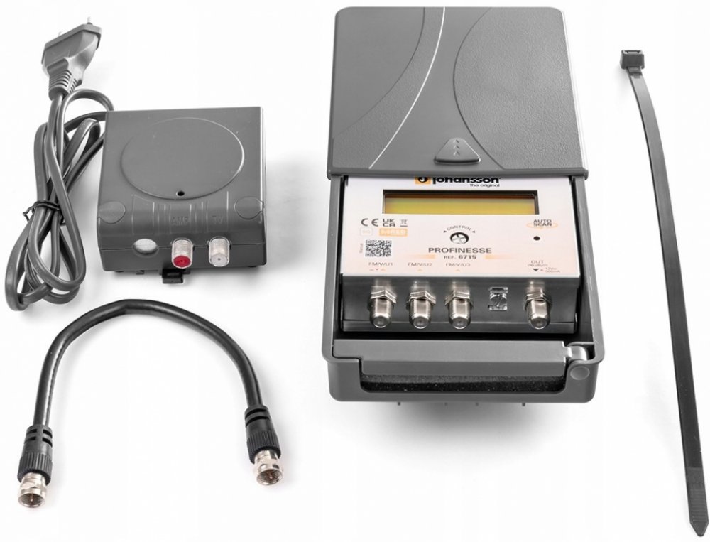 Součástí balení jsou všechny potřebné prvky pro spuštění instalace: napájecí zdroj Johansson 2438 (12 V), anténní kabel F-F o délce 25 cm a odolná řemínek o rozměrech 300 x 6 mm. Díky tomu nemusí instalátor hledat další příslušenství – vše je v jedné krabici. Hotová instalační sada výrazně zjednodušuje a urychluje montáž anténního systému a šetří čas i zdroje.