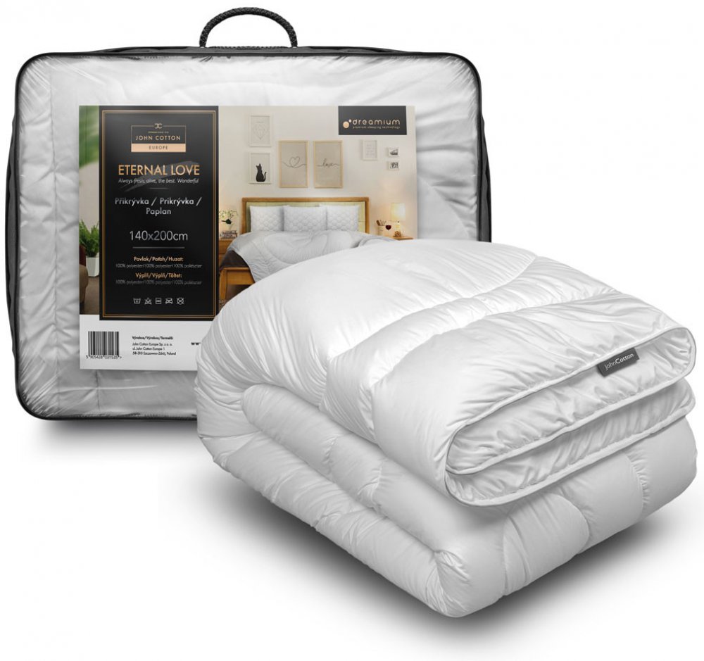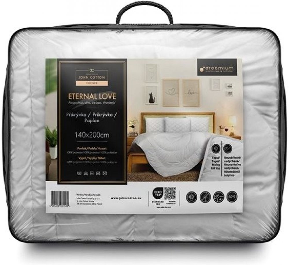 Celoroční přikrývka John Cotton měří 140 × 200 cm (š×d). Hypoalergenní úprava eliminuje riziko podráždění. Povrch je vyroben z mikrovlákna a polyesteru, proto vyniká hebkostí, odolností a nenáročnou údržbou. Výplň z dutého vlákna zajišťuje snadnou údržbu a dlouhodobý objem. Dá se prát v pračce. Klíčové vlastnosti produktu JOHN COTTON Příkrývka DREAMIUM Eternal Love, 140 × 200 cm Přikrývka John Cot...