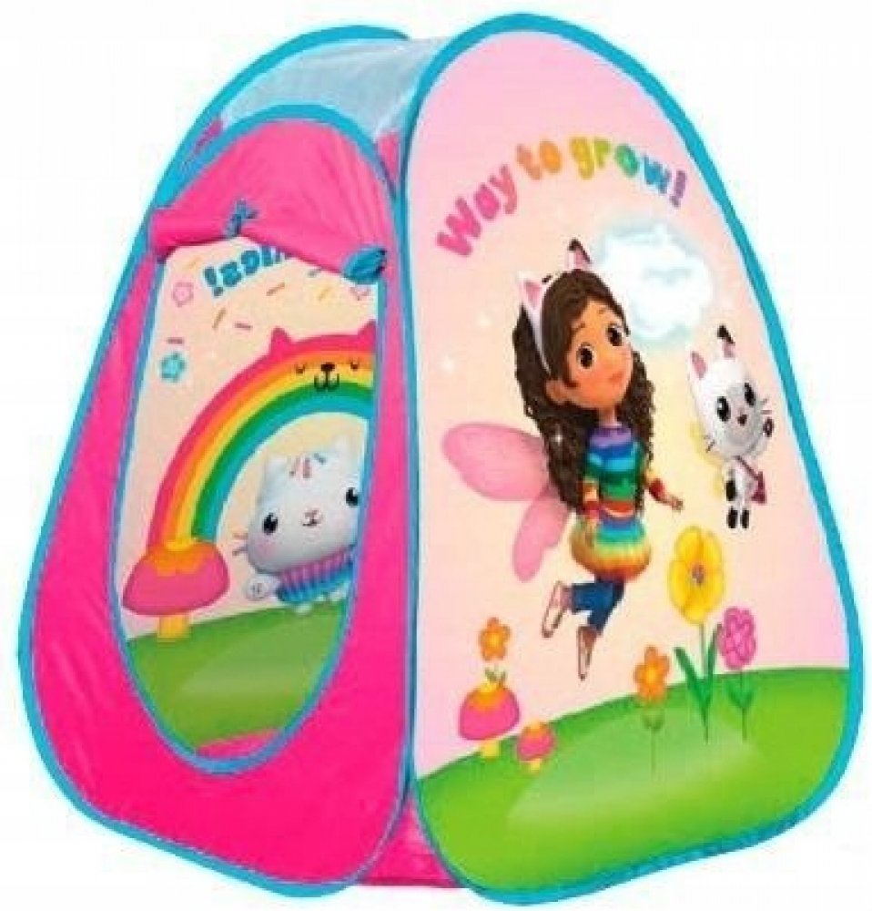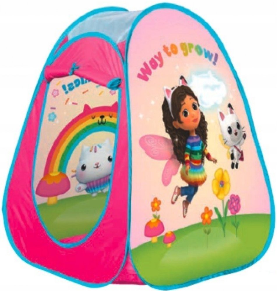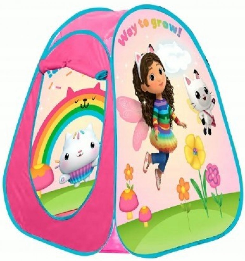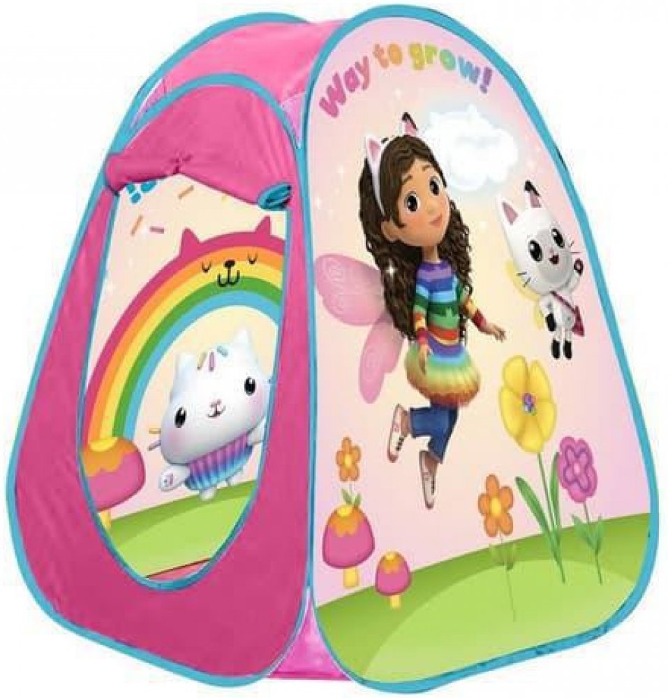 Dětský látkový stan Gabbys Dollhouse. Stan je snadno složitelný i rozložitelný, díky kvalitním pružným drátkům v obvodu stanu. Na stříšce stanu je síťka, přes kterou dovnitř proniká světlo. Stan se dá pohodlně složit pro uskladnění. Rychlé postavení díky funkci rychlého rozložení „Pop-up". Do stanu se vstupuje látkovými dveřmi, které lze zavázat provázkem.
