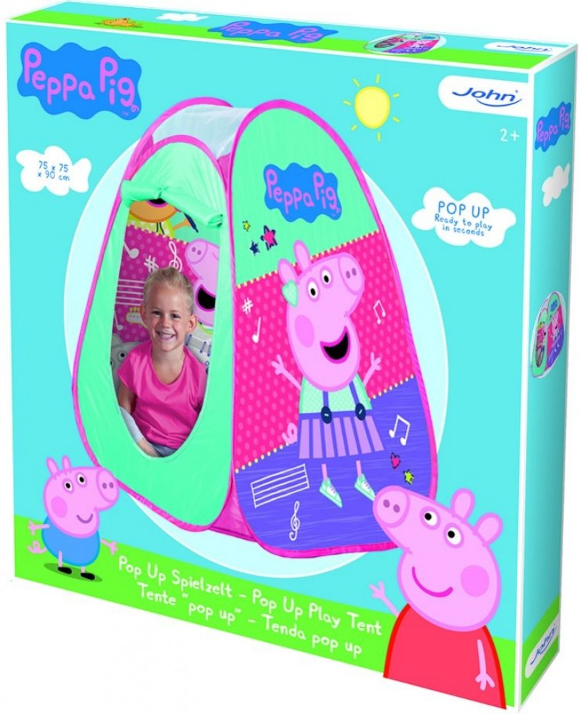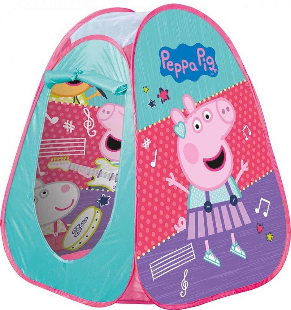 Dětský látkový stan s licencí Pepa Pig. Rozměr složeného stanu 75x75x90cm. Stan je snadno složitelný i rozložitelný, díky kvalitním pružným drátkům v obvodu stanu. Stan má nahoře síťovinu. Baleno v