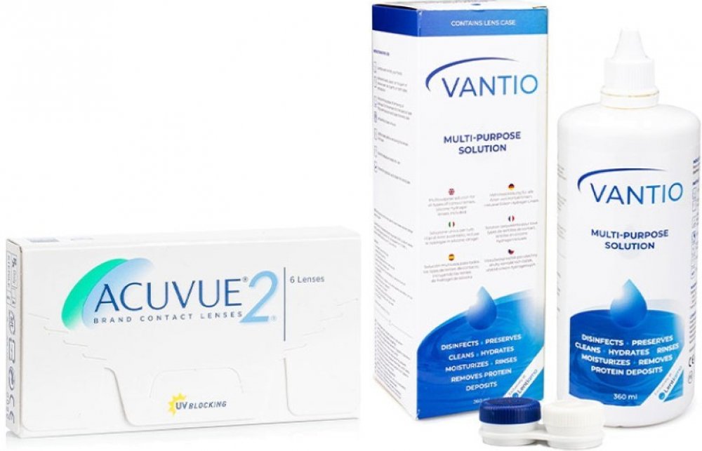Dvoutýdenní kontaktní čočky Acuvue 2 (6 čoček) nabízíme ve zvýhodněném balíčku s roztokem Vantio Multi-Purpose 360 ml. Acuvue 2 jsou 14ti-denní kontaktní čočky pro denní způsob nošení od společnosti Johnson & Johnson. Patří mezi jedny z nejoblíbenějších a nejrozšířenějších kontaktních čoček. Obsahují indikátor rub a líc, jsou zabarveny pro snazší manipulaci a nabízejí vysokou ochranu před UV zářením. UV filtr v kontaktních čočkách zdokonaluje ochranu rohovky oka před negativními účinky ultrafialového záření. Čočky však nezakrývají celé oko ani oční okolí, proto je ideální ochranou před škodlivým UV zářením kombinace kontaktních čoček s UV filtrem a slunečních brýlí. Vantio Multi-Purpose patří mezi nejnovější univerzální roztoky pro kompletní péči o všechny druhy kontaktních čoček a to včetně silikon-hydrogelových. Svým uživatelům nabízí optimální poměr kvality a ceny, díky čemuž se řadí mezi velmi populární roztoky na trhu. Víceúčelový roztok Vantio Multi-Purpose odstraňuje z čoček bílkovinné usazeniny, dezinfikuje, zvlhčuje a je určen také pro oplachování a uchovávání kontaktních čoček. Vyrábí se v Itálii stejně jako jeden z nejprodávanějších roztoků v našem eshopu Solunate Multi-Purpose. Vantio Multi-Purpose je skvělou alternativou pro jiné univerzální roztoky na kontaktní čočky, jako jsou například: All In One Light, Zero-Seven Refreshing, Options Multi, Solocare Aqua, Max Optifresh, Horien Ultra Comfort. Roztok Vantio Multi-Purpose můžete exkluzivně zakoupit v našem eshopu, nabízíme ho rovněž v ekonomicky výhodných balíčcích. Výroba čoček Acuvue 2 byla ukončena. Dostupné jsou pouze varianty skladem. Uživatelé čoček Acuvue 2 mohou přejít na kontaktní čočky Lenjoy Bi-weekly Aqua+. Vzhledem k rozdílným parametrům však doporučujeme přeaplikaci značky konzultovat s očním lékařem.