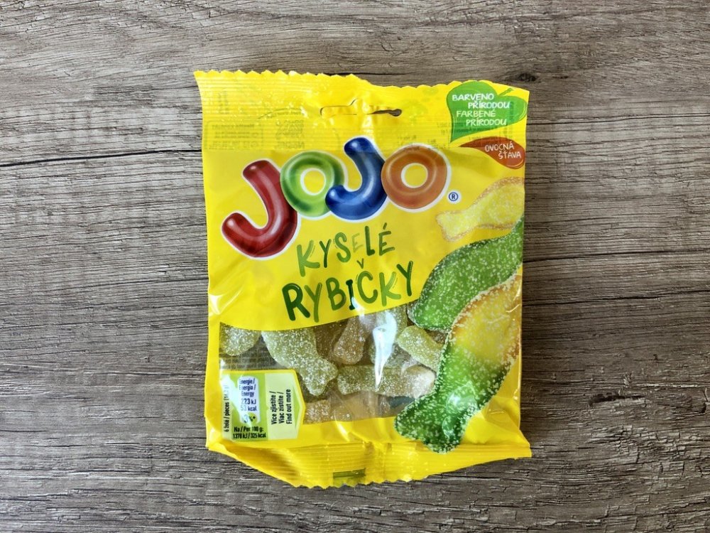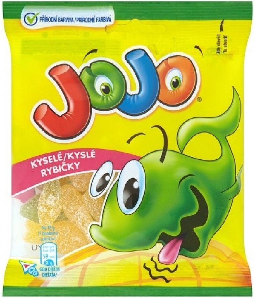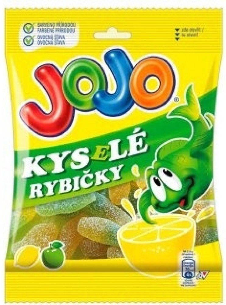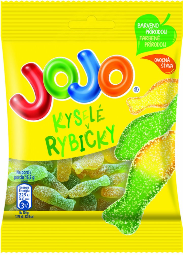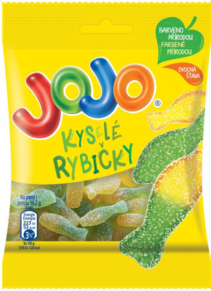 JOJO Kyselé rybičky jsou měkké a šťavnaté díky tomu, že obsahují ovocnou šťávu.