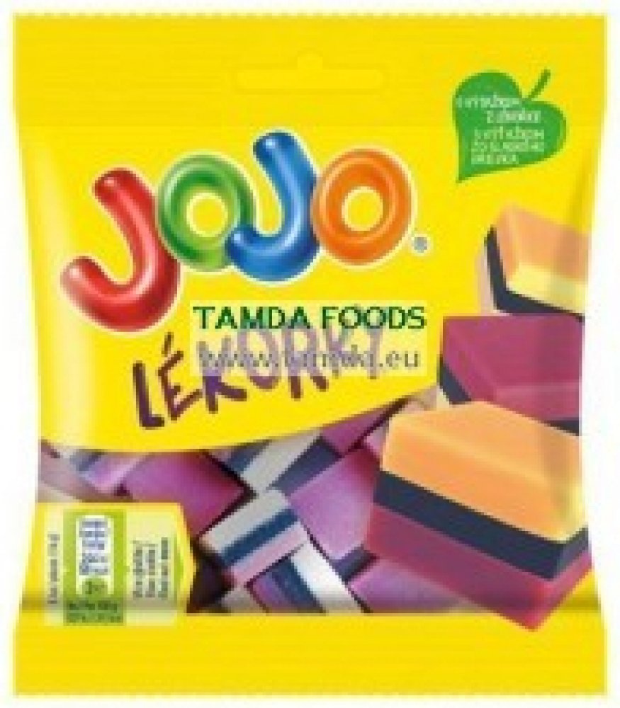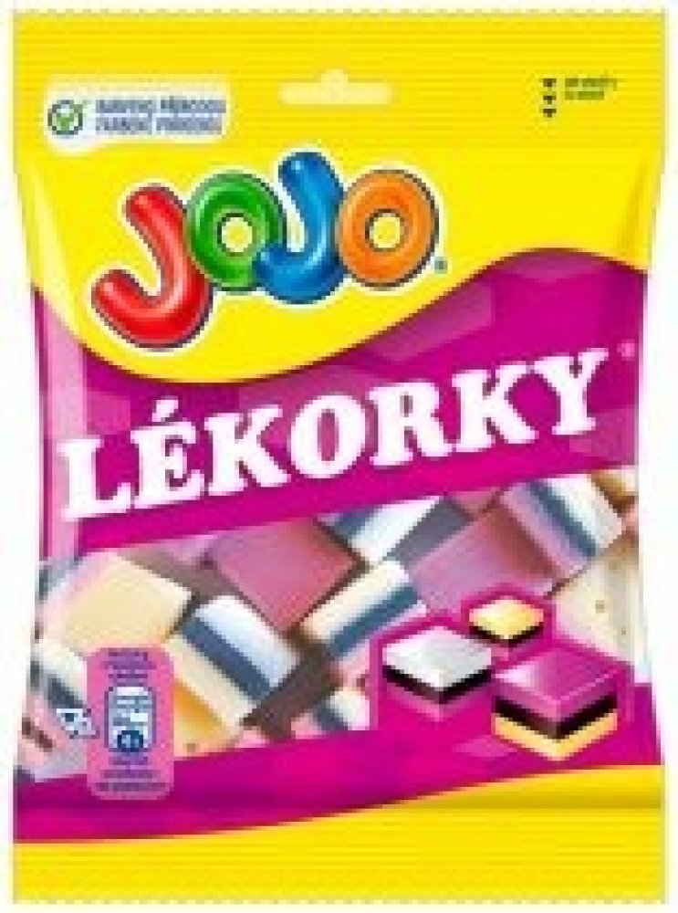 - Složení: Cukr, lékořicová složka (cukr, pšeničná mouka, pitná voda, glukózový sirup, lékořicový extrakt, barviva: rostlinná uhlíková čerň, amoniak-sulfitový karamel; emulgátor: mono- a diglyceridy mastných kyselin; konzervant: sorban draselný; anýzová silice, aroma: anetol), glukózový sirup, glukózo-fruktózový sirup, kukuřičný škrob, rostlinné tuky (Shea, kokosový), želatina, aromata (banán, vanilka, borůvka, malina), rostlinné koncentráty (ibišek, mrkev, světlice barvířská), sirup z invertního cukru, kyselina (kyselina vinná), barvivo (karoteny), (vztaženo na lékořicovou složku)