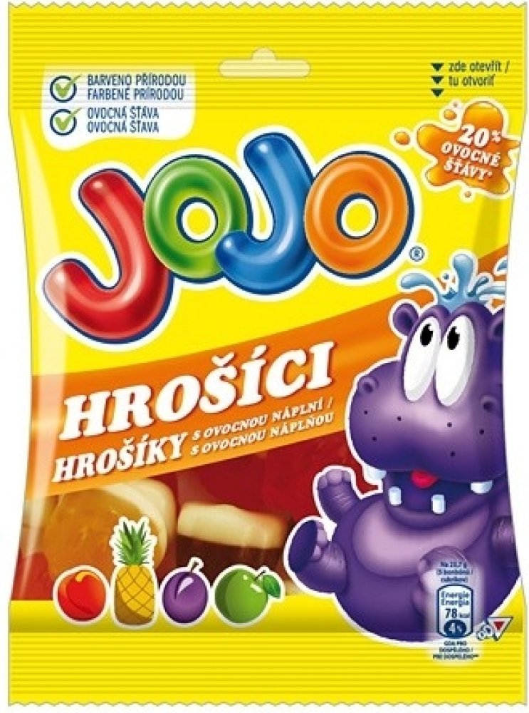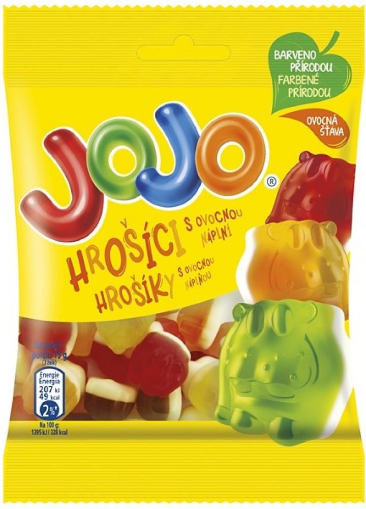Želé s ovocnými příchutěmi s náplní.JOJO Hrošíci jsou měkcí a šťavnatí díky tomu, že obsahují ovocnou šťávu.Barvu těchto bonbónů získáváme z výtažků nebo koncentrátů šťáv z rostlin, ovoce a zeleniny., www.nestle.czwww.jojo.cz, Želé s ovocnou náplní a ovocnými příchutěmi., Balení obsahuje 4 porce,