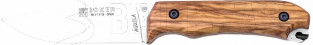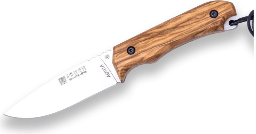 Univerzální nůž Aguila CO-104 je navržen pro nejrůznější outdoorové aktivity, jako například turistiku, rybolov, survival nebo myslivost. Tento nůž odlišují ozdobné střenky, které jsou zhotoveny z olivového a palisandrového dřeva. Čepel tohoto outdoorového nože je vyrobena z nerezové oceli Mova 1.4116 55-57 HRC. Díky tomu se ostří snadno a rychle brousí. To oceníme zejména v terénu. Profil drop-point a plošně broušené ostří jsou zárukou těch nejlepších řezných vlastností. Vroubkování na hřbetu čepele plní funkci opěrné plochy pro prsty. Pozornost si zaslouží ozdobné střenky rukojeti, které jsou vyrobeny z olivového a palisandrového dřeva. Střenky jsou pevně spojeny s konstrukcí nože pomocí dvou šroubů. Rukojeť pevně sedí v dlani, vyklouznutí brání jílec. Na konci rukojeti je umístěno očko, přes které je protažený řemínek. Joker Aguila charakterizuje kvalitní konstrukce, dobré řezné vlastnosti a klasický design, který navazuje na tradiční myslivecké nože. Specifikace: • kvalitní dřevěná rukojeť • tradiční design • čepel z nerezové oceli Mova • profil drop-point Součástí nože je kožené pouzdro, ve kterém lze snadno nůž přenášet.