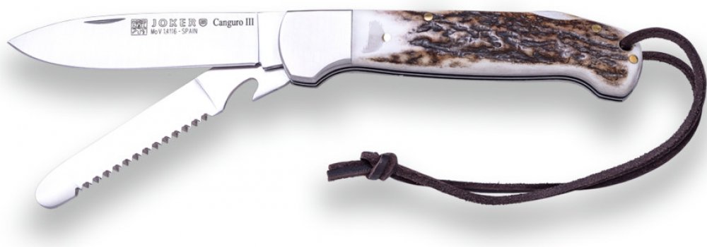 Ručně vyrobený zavírací nůž Canguro III NC136, který je vybaven čepelí a příruční pilkou s otvírákem. Střenky rukojeti jsou zhotoveny z jeleního paroží.