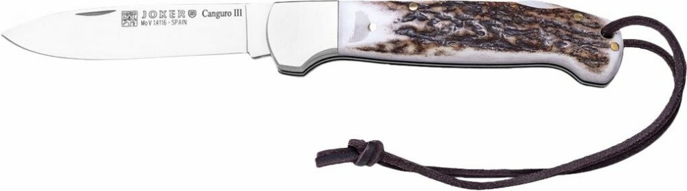 Joker Canguro svým designem navazuje na tradiční myslivecké nože. Čepel drop-point dosahující délky 85 mm je vyrobena z molybden-vanadiové oceli 1.4116, která je kalená na 51-54 HRC. Tento druh oceli se snadno brousí a vyniká svými řeznými vlastno...