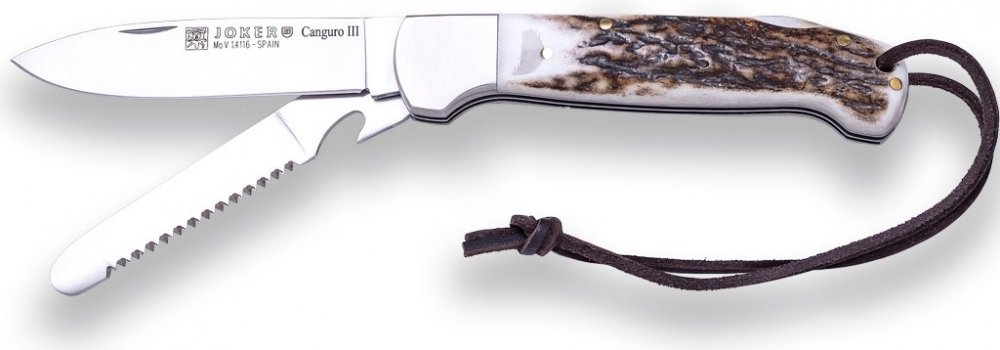 Multifunkční nůž Joker z oceli nabízí hned několik nástrojů: kvalitní čepel o délce 8,5cm a pilku s otvírákem. Střenky nože jsou z parohu