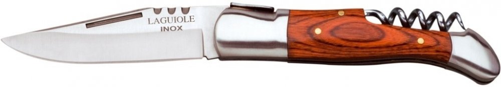 Kapesní zavírací nůž s vývrtkou španělské značky Joker. Tento ozdobný zavírací nůž je kompletně vyroben z odolné nerezové oceli. Rukojeť je tvořena dřevěnou střenkou. Zapuštěné ostří umožňuje bezpečně vysunout čepel jedním pohybem palce. Nůž najde uplatnění při provozování turistiky, rybaření nebo myslivosti.
