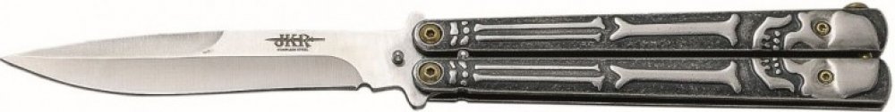-nůž typu motýlek s motivem kostlivce-střenka z nerezové oceli jištěná západkou