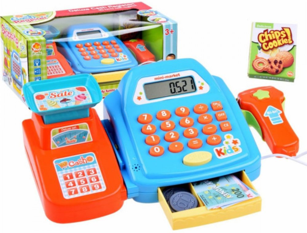 Modrá elektronická dětská pokladna s tlačítky zdobenými sladkými motivy je perfektním doplňkem do dětské hry na obchod, cukrárnu či market. Malí obchodníci si při hře procvičí základní aritmetické operace díky kalkulačce s měkkými tlačítky a mohou využít interaktivní čtečku s realistickými zvuky pro "skenu" zboží. Vše je zobrazeno na přehledném LCD displeji. Součástí pokladny je také váha, což přidává na realismu hry. Hračka podporuje rozvoj matematických schopností, sociálního chování a obchodních dovedností dětí. Pokladna vyžaduje pro svůj chod 2 x 1,5 V AA baterie, které nejsou součástí balení. Hračka je vyrobena z odolného plastu v poutavém designu a dodávána v barevné krabici, což ji činí ideálním dárkem pro děti.