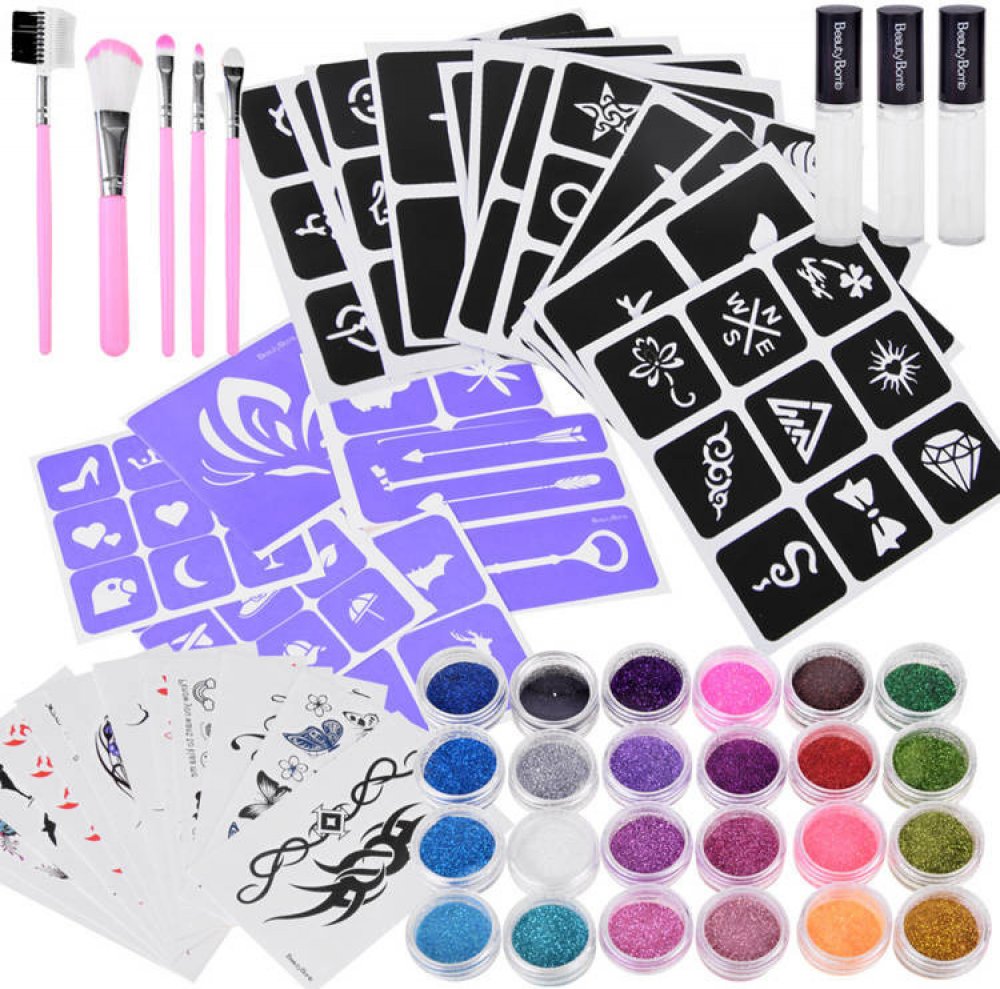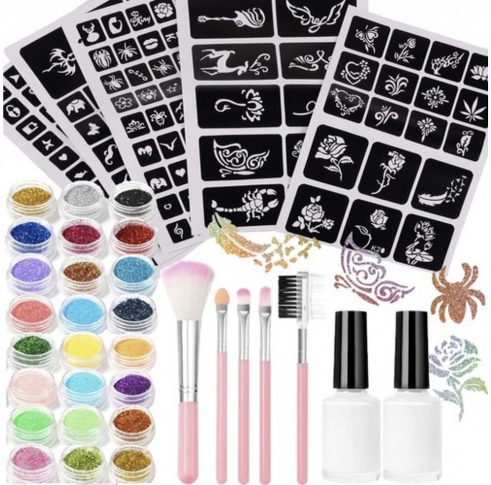 Tato mega velká sada tetování pro děti se bude hodit na každou školku, besídku, Andrzejki party, Silvestr, karneval nebo narozeninovou oslavu. Barevné třpytky vám poskytnou spoustu možností, jak vytvořit jedinečné tetování, a barevná výzdoba bude hezkou vzpomínkou po zábavné párty. Tetování je bezpečné pro jemnou pokožku vašeho dítěte, stačí pár koupelí, aby malá umělecká díla zmizela a zábava mohla začít znovu. V sadě:- 18 listů, na kterých najdete desítky šablon na třpytivé tetování různých velikostí,- 12 listů s vodovými tetováními,- 3 lahvičky lepidla na tetování,- 5 štětců na nanášení glitrů- 24 nádobek barevných glitrů. Jak používat:- vyberte šablonu z listu a nalepte ji na umytou a vyčištěnou pleť- naneste štětcem lepidlo na vybraný vzor- odlepte šablonu a počkejte několik sekund, než lepidlo trochu zaschne- popusťte uzdu své fantazii - naneste barevné třpytky!- odstraňte přebytečné třpytky a máte hotovo!