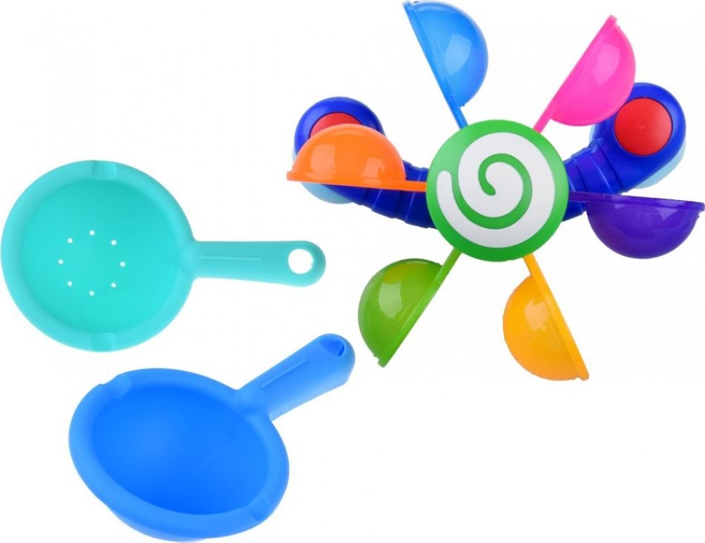 Barevné vodní kolo je zábavná hračka určená pro hru ve vodě během koupele. Hračka je připevněna přísavkami, což usnadňuje její upevnění na dlaždice v koupelně nebo na stěny vany či sprchy. Kromě toho je sada vybavena sítkem a naběračkou pro nalévání vody.Jak se hrát?Můžete vodu nalévat na hračku shora pomocí sprchové hlavice nebo pomocí naběračky či sítka. Měkké barevné šálky se pohybují, když dít...