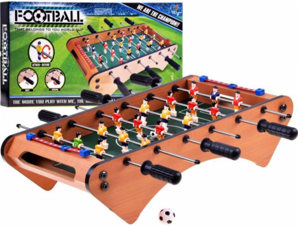 Známá hra stolní fotbal na dřevěném stole v klasické verzi v miniaturním provedení. Skutečný fotbalový turnaj u vás doma. Poskytuje spoustu vzrušení během zápasu. Dva týmy po 9 hráčích vzbudí v každém fotbalovém fanouškovi značné vzrušení. Hru mohou hrát minimálně 2 osoby a fanoušci mohou být přizváni k účasti.Hra se hraje pohybem hráčů a jejich otáčením pomocí rukojetí vyčnívajících z boku stolu. Hráči jsou umístěni po 3 na kovových tyčích jako u klasického herního stolu. Stůl je vyroben ze dřeva. Hráči, kuličky a další prvky jsou vyrobeny z plastu..