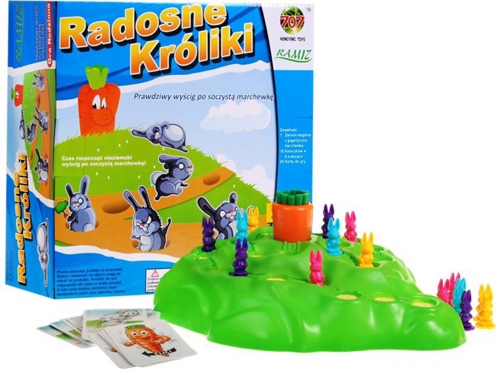PopisRADOSHY RACES - Skutečný závod (707-5) Zelený kopec musí být umístěn uprostřed stolu.Každý hráč má na výběr 4 králíčky stejné barvy.Hrát mohou maximálně 4 hráči, pokud se zapojí méně hráčů, musí být zbylí králíčci odloženi do krabice.Jeden hráč musí zamíchat karty a položit je na stůl lícem dolů.Hru začíná nejmladší hráč, zajíčci se pohybují po směru hodinových ručiček.Principy hryHráč, který začíná hru, si vezme první z karet, pak začne závod podle toho, co je na kartě (zajíček skočí dopředu o jedno pole,o 2 pole,o 3 pole).Pole, která jsou obsazena jinými králíky, se nepočítají.Karta mrkve - znamená, že hráč musí otočit mrkev, která je na ní, ve směru hodinových ručiček.Může se objevit díra, do které králík spadne.Pokud se na trase králíka objeví díra, počítá se jako další pole, ale pokud na ní králík stojí, zmizí v "břiše kopce".Obsah sady - 1 zelený kopec s obří mrkví o rozměrech přibližně 29 cm x 26 cm,- 16 králíčků (ve 4 barvách: růžové, fialové, modré a žluté),- 24 hracích karet..