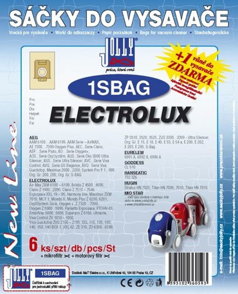 JOLLY 1SBAG papírové sáčky do vysavače jsou shodné typem a tvarem jako originální sáčky do vysavače S-BAG. Sáčky pro vysavač 1SBAG jsou vyrobeny z vícevrstvého filtračního papíru se zárukou kvality materiálu a provedení. Sáčky jsou vhodné pro podlahové vysavače ELEKTROLUX, AEG AirMax, Clario, Ergospace, Jet Maxx, Twintech a další typy vysavačů a pro vysavače ostatních výrobců jako například PHILIPS, VOLTA, TORNADO, ZANUSSI.