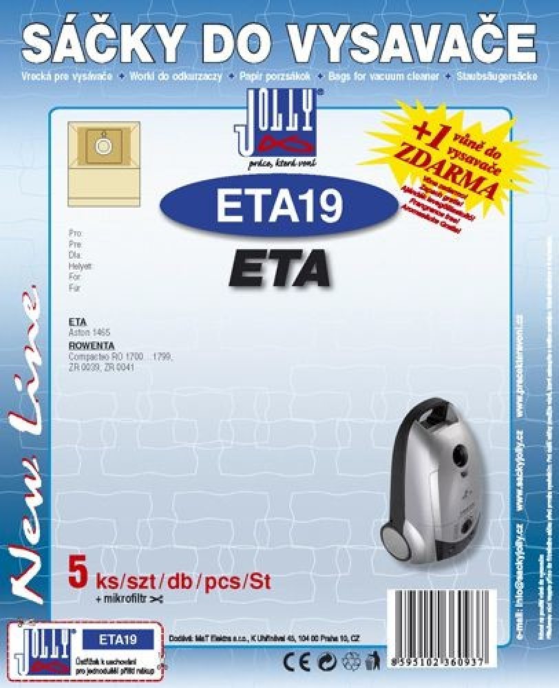 Sáčky do vysavače ETA19 papírové 5ks pro ETA Aston 1465 a ROWENTA Compacteo, ROWENTA Compacteo Ergo v jednom balení sáčků, kompatibilní s filtry ETA 1465 68000, ROWENTA ZR003901, ROWENTA ZR004101, WORWO RMB14K, SWIRL S70, MENALUX 2111 jsou vhodné do vysavačů BOSCH, SIEMENS, UFESA, ZANUSSI a pro modely uvedené níže. Ke každému jednomu originál balení 5ks papírových sáčků značky Jolly, obdržíte univerzální mikrofiltr k zastřižení a navíc ZDARMA vzorek vůně do vysavače, která zbaví filtry vysavače nepříjemných zápachů a provoní celý byt nebo kancelář.