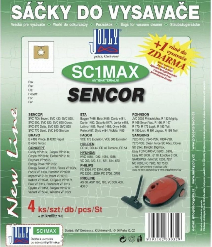 Sáčky do vysavačů JOLLY SC1 MAX textilní, 4ks sáčkůSáčky do vysavačů SC1 MAX Jolly textilní 4ks pro vysavače ETA, SENCOR, SAMSUNG v jednom balení sáčků s ETA 960068000 eBAG, ETA 960068010 eBAG, ETA 960068020 eBAG, ETA UNIBAG č.11, MENALUX 1840, MENALUX 1900, MENALUX 4000, SWIRL Y50, WORWO MPMB02K, WORWO DMB01K kompatibilní, jsou vhodné do vysavačů ROHNSON, PROGRESS, GORENJE, DOMO, FAGOR, HYUNDAI, SOLAC, SEVERIN, TESLA, TESCO, CLATRONIC, BRAVO, ECG, CONCEPT a pro modely uvedené níže. Ke každému originál balení 4ks sáčků značky Jolly, obdržíte univerzální mikrofiltr k zastřižení a navíc ZDARMA vzorek kvalitní vůně do sáčku vysavače, které zbaví filtry vysavače napříjemných zápachů.
