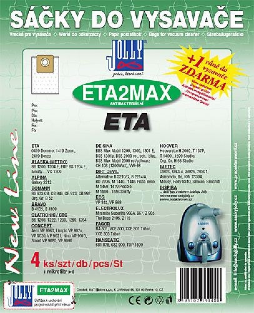 Sáčky do vysavače SENCOR - SVC 45 SENCOR textilní antibakteriální 4ks Jolly ETA2 MAX to je balení 4 ks náhradních sáčků do vysavačů AFK, Alaska, Alpina, Atlanta, Blue Sky, Bomann, Eta 419, ETA Domino, Zoom, Bosco, Eurotech, Eup, Flama, Fif, Hoover, Imetec, Melissa a mnoha a dalších značek a typů, vysavačů, z netkané textilie, antibakteriálních, součástí balení je 1x vůně zdarma, 1x filtr. Sáčky do vysavače SENCOR - SVC 45 SENCOR můžete použít jako náhradní sáčky pro modely vysavačů zde uvedené. Tyto sáčky jsou alternativou (neoriginální náhradou) sáčků původních, které byly ve vašem vysavači osazeny při jeho zakoupení.Sáčky Jolly ETA2 MAX do vysavače SENCOR - SVC 45 SENCOR4ks v balenínetkaná textilie1x mikrofiltr do vysavače univerzální - k zastřižení.1 x vůně do vysavače. Vonnou tyčinku (nebo granulky) vložíte nebo vsypete do prachového sáčku vysavače - vždy při jeho výměně. Při vysávání příjemně provoní interiér jemnou vůní z přírodních materiálů Sáčky do vysavačů SENCOR - SVC 45 SENCOR jsou vhodné pro modely a značky:ALASKA ES 1204, VC 1430, BS 1200, BS 1204, Mousy, VC 1300, VC 1900AFK Alternative B, BS 1300 Electronic, PS 1200 Power Shorty, PS 1300 M, PS 1500 W1 NeALPINA Galaxy 2212, SF 2202 GenesisATLANTA ATH 3450, ATH 3250BOMANN BS 496 CB, BS 968 CB, BS 973 CB, CB 973, CB 992BRAVO B 4105, B 4109, B 4308 ClioBERTON Mini BouleBLUE SKY AP 150.9, BVC 2010, BVC 2022, BVC 236, BVC 818BLUE WIND BVC 818/SBOB HOME 2397, 2544, 2545, Crazy Vac 2351BOMANN BS 496 CB, BS 968 CB, BS 973 CB, CB 946, CB 973, CB 992BOOSTY TEK 120, TEK VC 007CLATRONIC BS 1208, BS 1222, BS 1230, BS 1250, BS 1264, BS 1272, BS 1275 ECO,CONCEPT VP 9010 Nino, VP 9020 Limpio, VP 9021 Limpio, VP 9060 Aero, VP 9080 Smart, VP 9090CAREFOUR BVC 818/SCONDEL 2810DAEWOO RC 230DE SINABBS Max Mobil 1300, BBS Max Mobil 1301, BBS 2000, VC 9901DELOS PlutoDAEWOO RC 230DIRT DEVIL Alternative B 2210, B 2214, BD 2206, Picco Bello, M 1460 Piccolo, M 1470 Piccolo, M 1550...1556 Swiffy, M 1559, M 7007 Cooper, M 7015 Swiffy, Salco Caddy, SDC 1400DOMOSTAR M 1554E-MATIC K 017, ST 017ECRON VC 201, VC 2050ECG P 845, VP 868EIO série 731ELECTROLUX Minimite Superlite 966A, 967, Z 965, The Boss Z 2105, Z 2115, Z 965 Minimite Superlite, Z 966 A Minimite Superlite, Z 967 Minimite SuperliteEL STAR S 188, S 200ELCO EL 236, EL 505ELDOM OS 1300, Royl Lux FD 12ELVITA Formular 1400, 7221 V 2000ETA .419 Serie, 0419 Domino, 1419 Zoom, 2419 BoscoEUP 100 C, 1200, 1204, EUP SenatorEUROTECH TEK VC 007FAGOR Deba 802, RA 301, VCE 105 Triton, VCE 300, VCE 301, VCE 302, VCE 303, XCE 301 Triton, XCE 303 TritonFAM ACEFAVORIT Tomato Compact 749, Typhoon Silver 740FERM HVC 610, HVC 620FERRARI 152G, 15V3, Compact Power 1400FIF EVC 082, KS 1200, KS 1288, KS 1200FLAM 1610 elFUDA ZW 100-36, ZW 90-36GEMEX BS 1204GOBLIN ACE SerieGOODMANNS YL 110GUZZANTI GZ 15HANSEATIC 681 878, 682 000, Forester, Top 1500HIT Company BS 1300, Turbo DustyHOMETEX XtraHOOVER Hooverette H 2050, Org. Gr. H 55 Studio, Studio T1400...1599, T 137P, T 1500...1599 Studio, HYUNDAI HVC 1081 LilacCHROMEX Ch 283, Ch 284, CH 285, CH 960IDELINE - Avanti, Blue Valido, Lagoon, Silence, Smart Move, Spinel, Tornado....INSPIRA Elco, IN 4500, IN 4501, Premium PR 4032ITO VC 9901E, VC 9903, VC 9905, VC 9007IMETEC 08020, 08024, 08026, 70301, Asiromdo, Aspirondo, Bo, ION 73304, Mousy, Rolly 8310, Smicrobo,KENI KST 15KING D HOME YL110BLENIGA K 100, K 113LERVIA KH 1400LLOYDS 015/377, 154/749, 411/649, 443/724...MAGIC S 198MASTERCRAFT MAXUM 1400MATSUI MVC 1400 VMMELISSA Pamero, Calzit, Mirage, TornadoMIO STAR PiccoMONTISS 1400MOULINEX Boogy CEG1, Boogy CEG 2, Booly MO 1013FA, CEG 151, CEG 251, Gimini CEP 1, Gimini CEP 2, Gimini CEP 3, PrincipioMPM Heros Plus, Tag, VC 007 Tec, VC 2020 IkarNEVIR NVR 5100A, 5107A, 5110AOPTIMUM OK 1452, OK 1453, OK 1454, OK 1603ORAVA VY 201 CompactPRIVILEG 420.042, 816.160, 928.045PROGRESS Colibri, P 56,P 67, PC 2100 - 2199PROLINE VC 35 B, VC 350, VC 450, VC 45B, PROTECH PVC 1200, VC 1200REMINGTON BV 100ROHNSON Dirt Bug, R 152ROWENTA Gimini, RO 1313, RO 1321, RO 1336, ZR 001701ROMIX SpacioSCARLETT SC 080 Felix, SC 084 Marcus, SC 081, SC082, SC1082, SENCOR SVC 45SEVERIN 1300, BR 7620, BR 7920, BR 7921, BR 7922, BR 7923, BR 7924, BR 7926, BR 7927, BR 7930, BR 7933, BR 7938, BR 7950, BRZ 7951, BR 7954, R 7955, BR 7970, BR 9603, BR 9662, BR 9666, SB 9022SALCO CaddySATURN ST 1277, ST 1283SCARLETT Felix, MarcusSENCOR SVC 45, SVC 52SOLAC A 304 Picollo, A 502, AB 2600, AB 2650, Bravo, Eolo, Eolo Power, Piccolo, Power Shorty PS ,TAURUS Golf 1200 do r. 2003, Golf 1300 do r. 2003, Golf 1400 do r. 2003, Golf 1500 do r. 2003, Golf 1600 do r. 2003, Smart Serie 1300, Smart Serie 1400, Squadra 1400 ESEVERIN BR 7620, BR 7920 až 7927, BR 7930 až 7938, BR 7950 až 7955, BR 7970, BR 9603, BR 9662, BR 9666, BR 9022SCHOTT GM 1500, ST 22, 24, 26SILVA TB 13, BS 13-200SKYLINE HD 802SMART VAC A 3330SMC Beatle, KeverSOLAC A 502,Picollo, Eolo, SOLAC Eolo Power, Power ShortySPEED YL 110STANDARD CH SR 2050, SR 2070STAR S 2020SUPERIOR CS 880SILVERCREST SBBK 700 A1, SBBK 700 A2TAURUS Golf 1200, Golf 1300, Golf 1500, Golf 1600, Smart 1300, Smart 1400, Squadrea 1400TCM TCHIBO Precision TCM 49329, Smart, TCM 20 1506, TCM 21 1115, TCM 49 329TESLA TEAM 27 , 28, BS 969E, SPBSS 1600, SPBSS 2001, 1, ST 2, 1200, ST 21, ST 31, ST 33, ST 34, Turbo Dusty, VC 105, VC 4477TORNADO CocoTRION TR 8500TRISA Comfort Vac, TurbolinoTRISTAR Quicksystem, SZ 1902, VC 100 DS, XX 9049UFESA Arian Mousy, AT 7306, AT 7407 , AT 7506 Mousy, AT 9120, AT 9220UNITED VC 4111VITEK VT 1817 Panda, VT 1818WELTSTAR 1401, 1410, 411, 1800 TurboWESTFALIA Laser 2000WHITE&BROWN AT 2003ZELMER - 200ZINATIC ZN 6016....