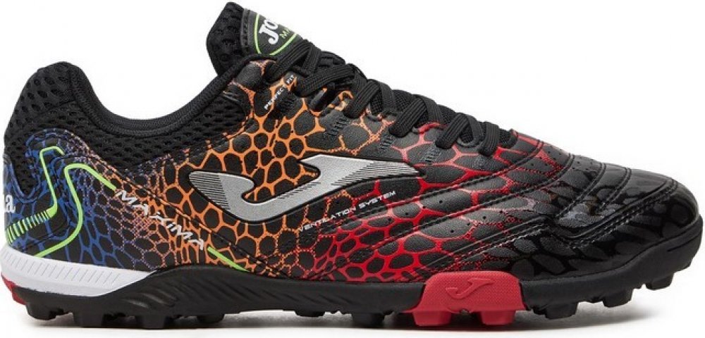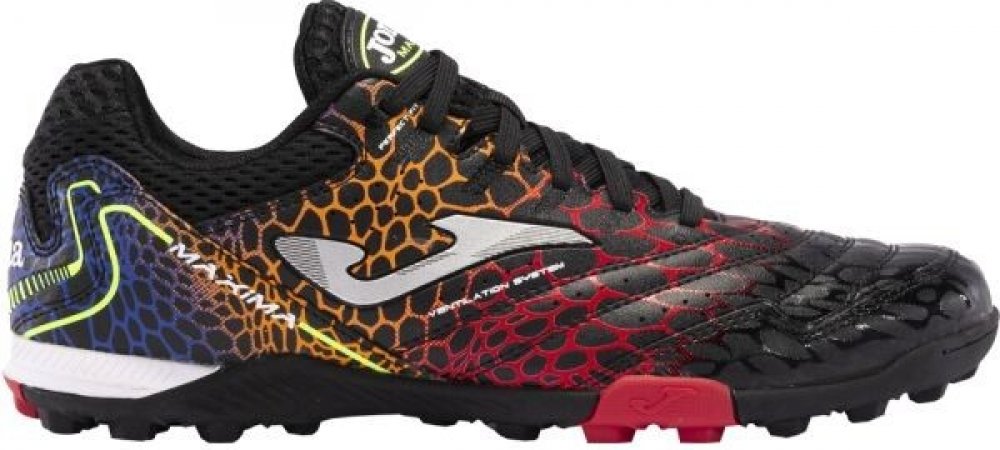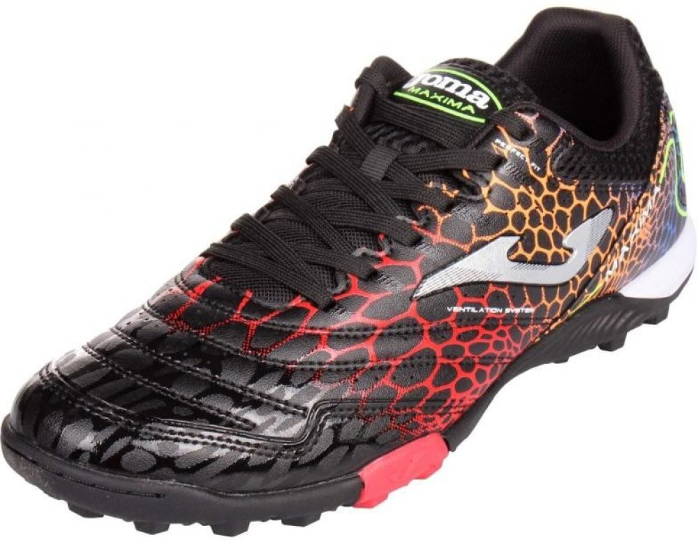 Turfy JOMA Maxima 2431 jsou kopačky s výrazným vzorkem na podrážce, která tak lépe přilne k povrchu a pomáhá fotbalistovi udržovat optimální stabilitu. Tento model na umělé povrchy je navržený pro začínající a rekreační hráče. Svršek vyrobený ze syntetického materiálu (Fibertech) je zkombinovaný s prodyšnou textilií s perforací VTS, která umožňuje cirkulaci vzduchu a zajišťuje tak správnou ventilaci. Vyztužení ve špičce Protection absorbuje dopad míče a umožňuje větší přesnost a sílu při střele. Podešev je vyrobená z vysoce kvalitní pryže s vynikající odolností proti oděru. K tomu byl použit systém DURABILITY, který prodlužuje životnost boty.