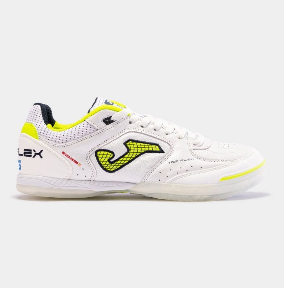 Model sálovek TOP FLEX pro sezónu 2022/23. Celokožená sálová obuv z klokaní kůže s prošitou špičkou, nebarvící podrážkou splňující normu DIN-70 a mírně odpruženou patou vrstvou EVA a vnitřním podšitím nylonem s pevností 600N/50mm. Vhodná do hal a tělocvičen. Na futsal, ale i na jiné halové sporty. Tato obuv je nejoblíbenější model, který JOMA pro sálové sporty vyrábí. Používá jí mnoho hráčů futsalové reprezentace ČR a většina hráčů 1. futsalové ligy. Nejlépe hodnocené sálovky. Váha 252 gramů. Díky jemné kůži se dokonale přizpůsobí tvaru nohy a tudíž umožní dokonalou kontrolu míče.