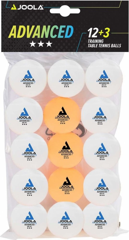 Míčky na stolní tenis JOOLA ADVANCED TRAINING*** jsou optimální pro hráče a kluby, jenž si zakládají na té nejlepší kvalitě při tréninku. Míček na stolní tenis vyrobený z ABS (se švem) se vyznačuje zejména svou vysokou odolností. V sadě naleznete 12 bílých míčků + 3 žluté.
