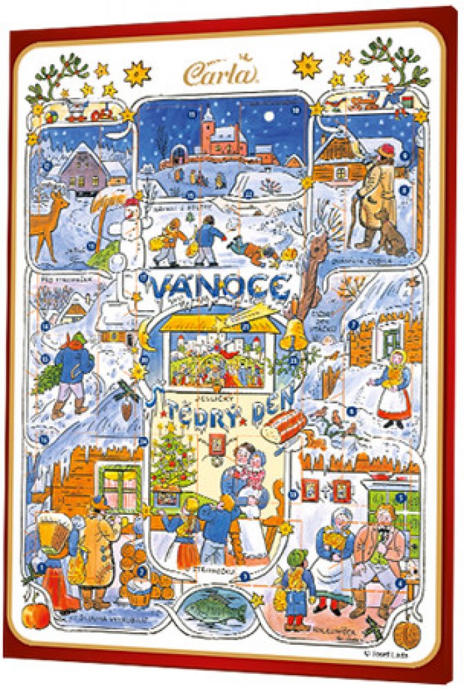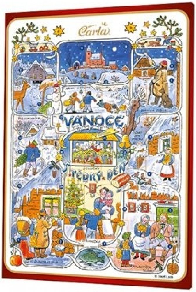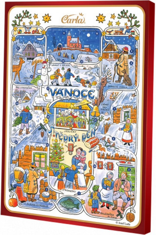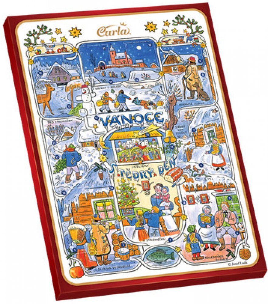 Cena se může v jednotlivých regionech lišit. -- Adventní kalendář. O značce Společnost CARLA spol. s r. o. je již od roku 1992 český výrobce čokolády ze Dvora Králové nad Labem. Nabízí širokou škálu svých hotových výrobků, ale také poskytuje široký sortiment pro průmysl a gastro jako např.: čokolády, polevy, náplně a fondán. Používá pouze ty nejkvalitnější suroviny z různých koutů světa a dbá na vysokou jakost zpracování za použití tradičních postupů. Kvalita na prvním místě Firma se snaží neustále zlepšovat své standardy ať už jde o ty kvality nebo služby. Jejich prioritou zůstává poskytování zákazníkům bezpečné a nezávadné produkty. Pravidelné certifikace napomáhají k neustálému růstu kvality. Firemní kultura „Náš výrobní závod se za 25 let své existence pružně a dynamicky rozvinul. Jeho zařízení splňuje ty nejpřísnější hygienické požadavky, kladené na potravinářské výrobky. V neposlední řadě věnujeme pozornost tvorbě esteticky hodnotného okolí závodu, které splňuje požadavky zdravého pracovního prostředí. Základním předpokladem dobrých výsledků je kromě kvalitních surovin a špičkových technologií také fungující a tvůrčí pracovní kolektiv. Proto jsme vytvořili kvalitní pracovní i sociální zázemí a svým zaměstnancům nabízíme všestrannou péči a pracovní perspektivu. Postupně budujeme atmosféru tvořivosti, důvěry a osobní odpovědnosti za dosažení stanovených cílů. Základní myšlenkou naší personální politiky je vytvoření pocitu sounáležitosti s firmou a spoluodpovědnosti všech zaměstnanců. Pracovní tým se vytváří nejen společným plněním úkolů, ale také na poli sportovním či kulturním.“ - 0.075.
