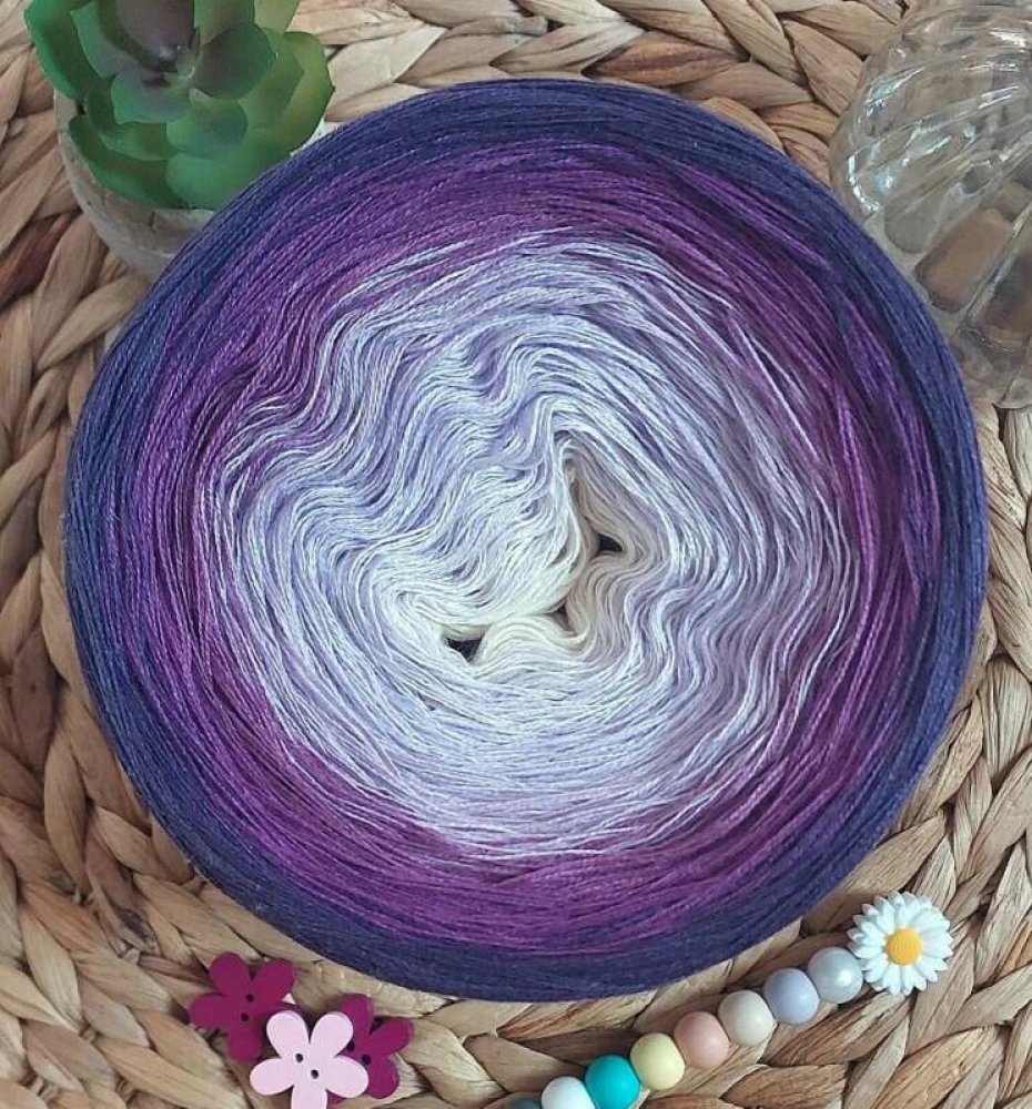 Spojení bílé a fialové působí čistě, romanticky a elegantně. Klubíčko se hodí na tvorbu šátků, svetrů, halenek, ale také menších doplňků, kde vynikne jemný barevný přechod. Díky složení 50 % bavlny a 50 % akrylu je příze příjemná na dotek, měkká a dobře drží tvar, takže se s ní krásně pracuje.