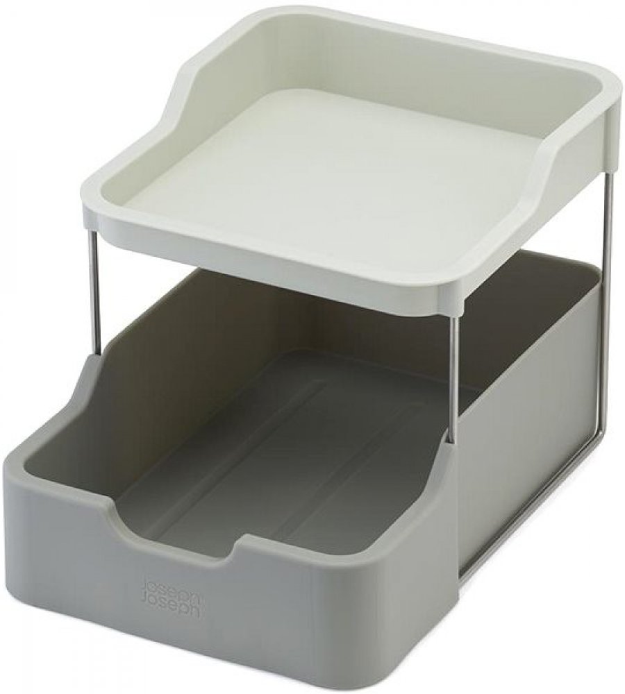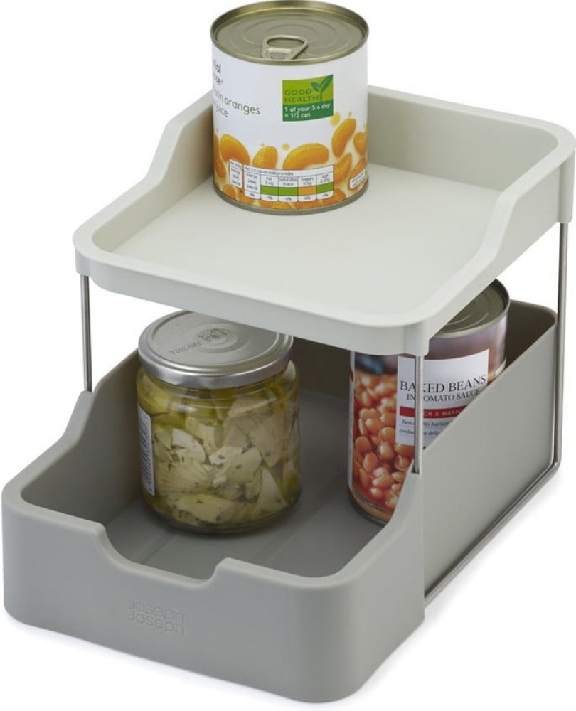 Dvoupatrový organizér JOSEPH JOSEPH Duo 851674 vám pomůže udržet pořádek v kuchyňské skříňce. Dvě nad sebou umístěné poličky - horní ideální pro skladování sklenic a plechovek, spodní (výsuvná) vhodná na tuby a potraviny v malých balení. Organizér je určen pro skříňky s vnitřní hloubkou alespoň 26,5 cm.