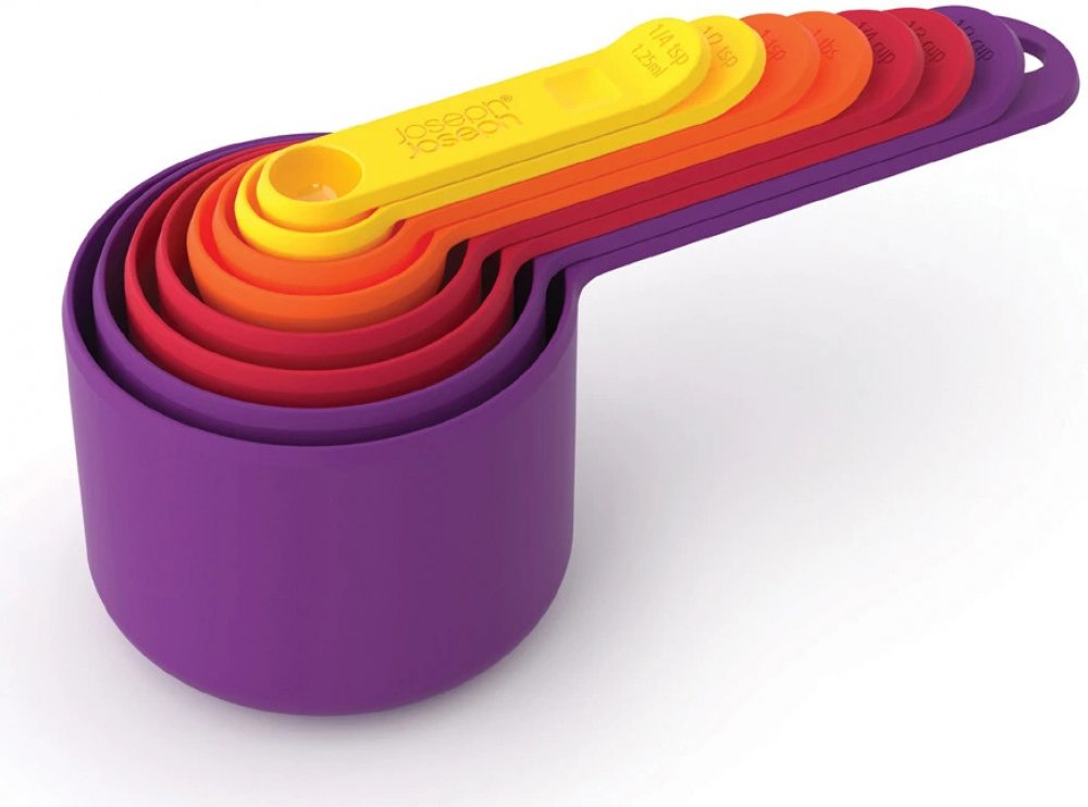 8-mi dílná sada odměrek JOSEPH JOSEPH Nest Measure – od 1 čajové lžičky (1,25ml) do 1 šálku (250ml). Díky kompaktnímu designu nezabírá místo v zásuvce - odměrky se nacvakávají jedna na druhou pomocí výstupků v držadlech. Lze mýt v myčce.