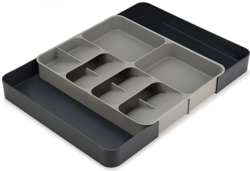 Roztahovací organizér do zásuvky JOSEPH JOSEPH DrawerStore Expanding 85166. Ukládání příborů pod úhlem nad sebou - ušetří více než polovinu místa v zásuvce. Příbory lze vkládat do označených slotů oboustranně. Dvě přihrádky určeny k uskladnění malých nástrojů. Roztahovací díly k ukládání velkých nástrojů.